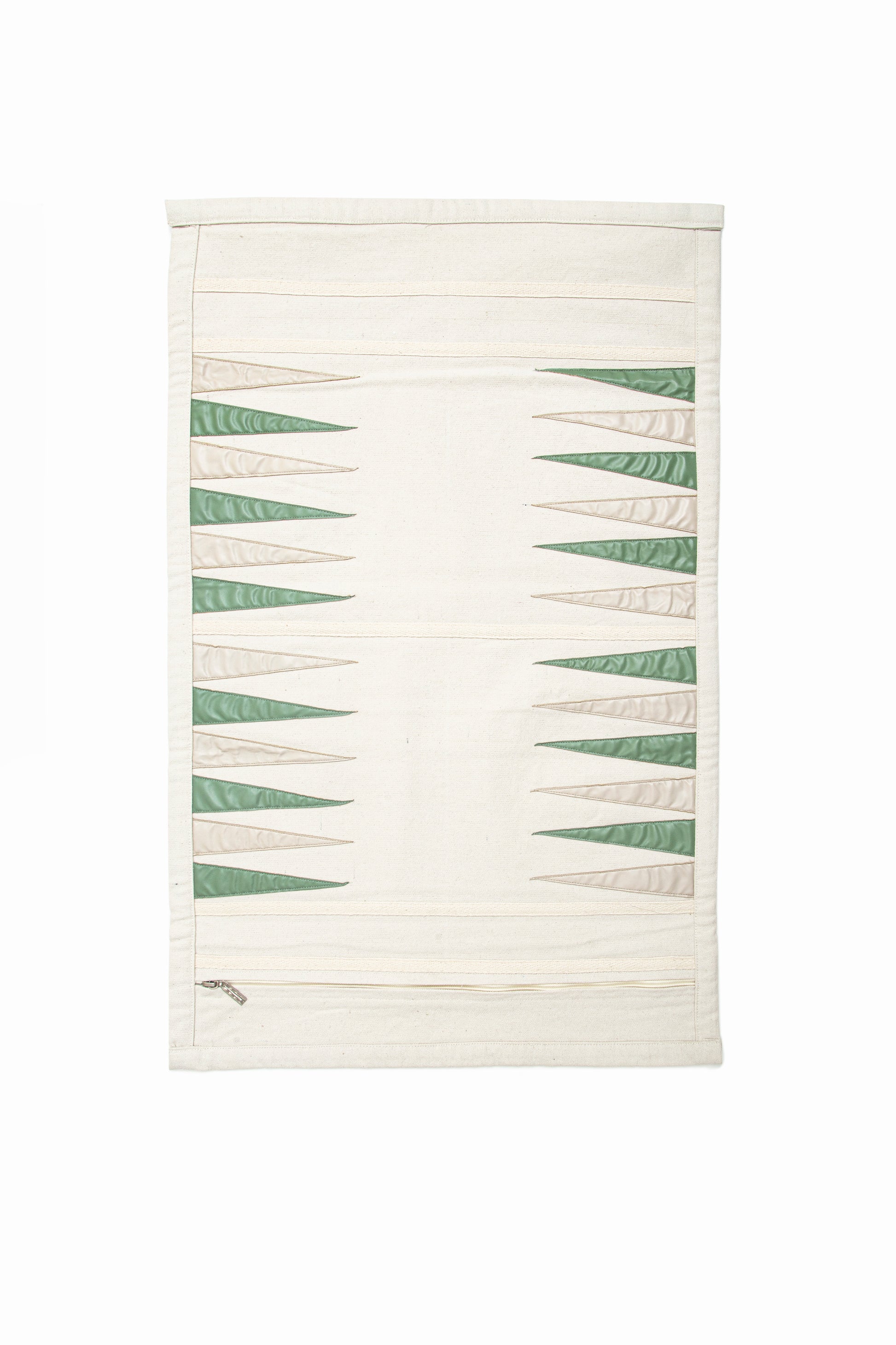 The roll-up backgammon board is made from cotton canvas with earthy-tone leather pieces stitched for a unique touch. It features a side zip pocket to store game pieces and dice and a co-branded label on the outside. It is wrapped with a ribbon for a stylish look.
