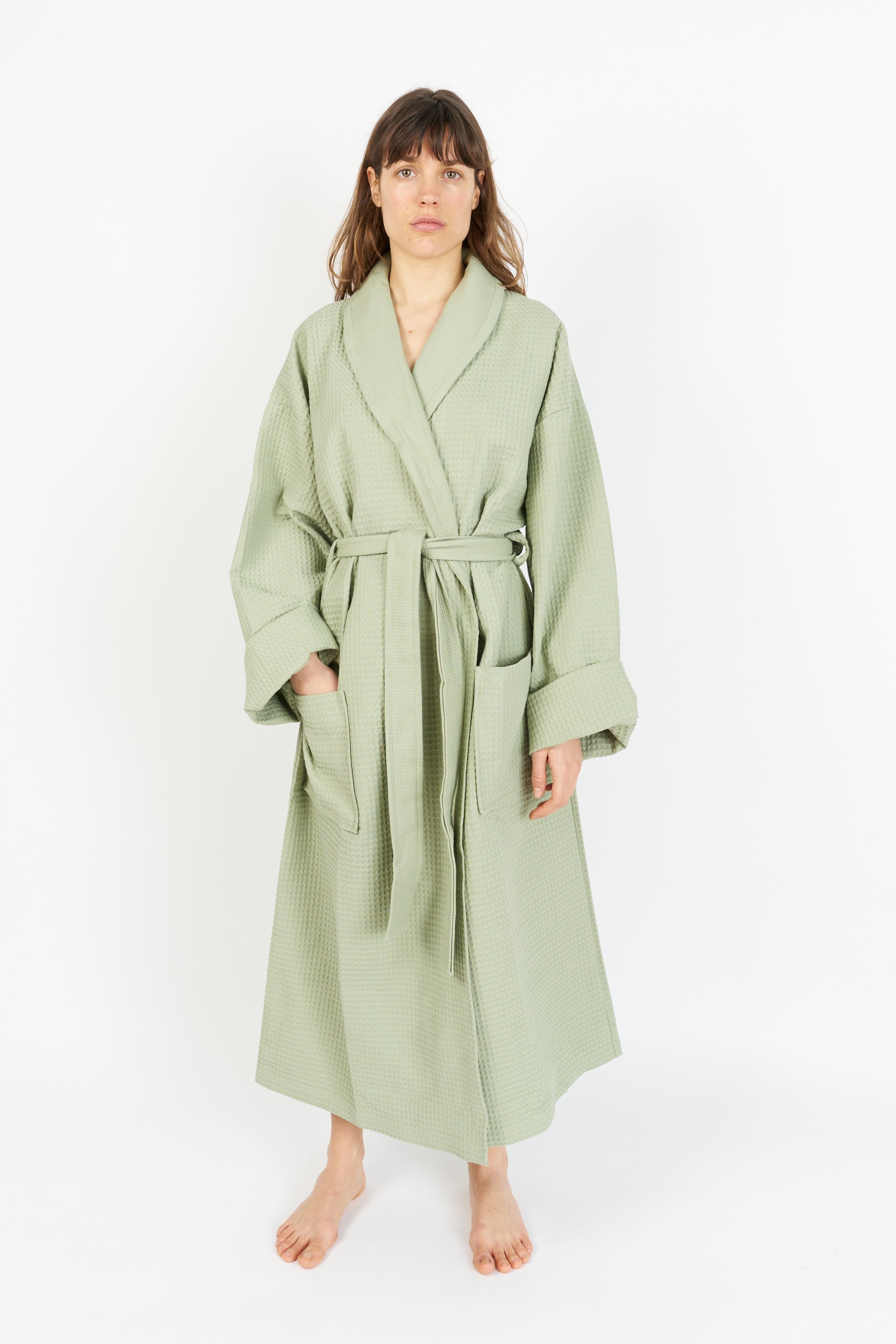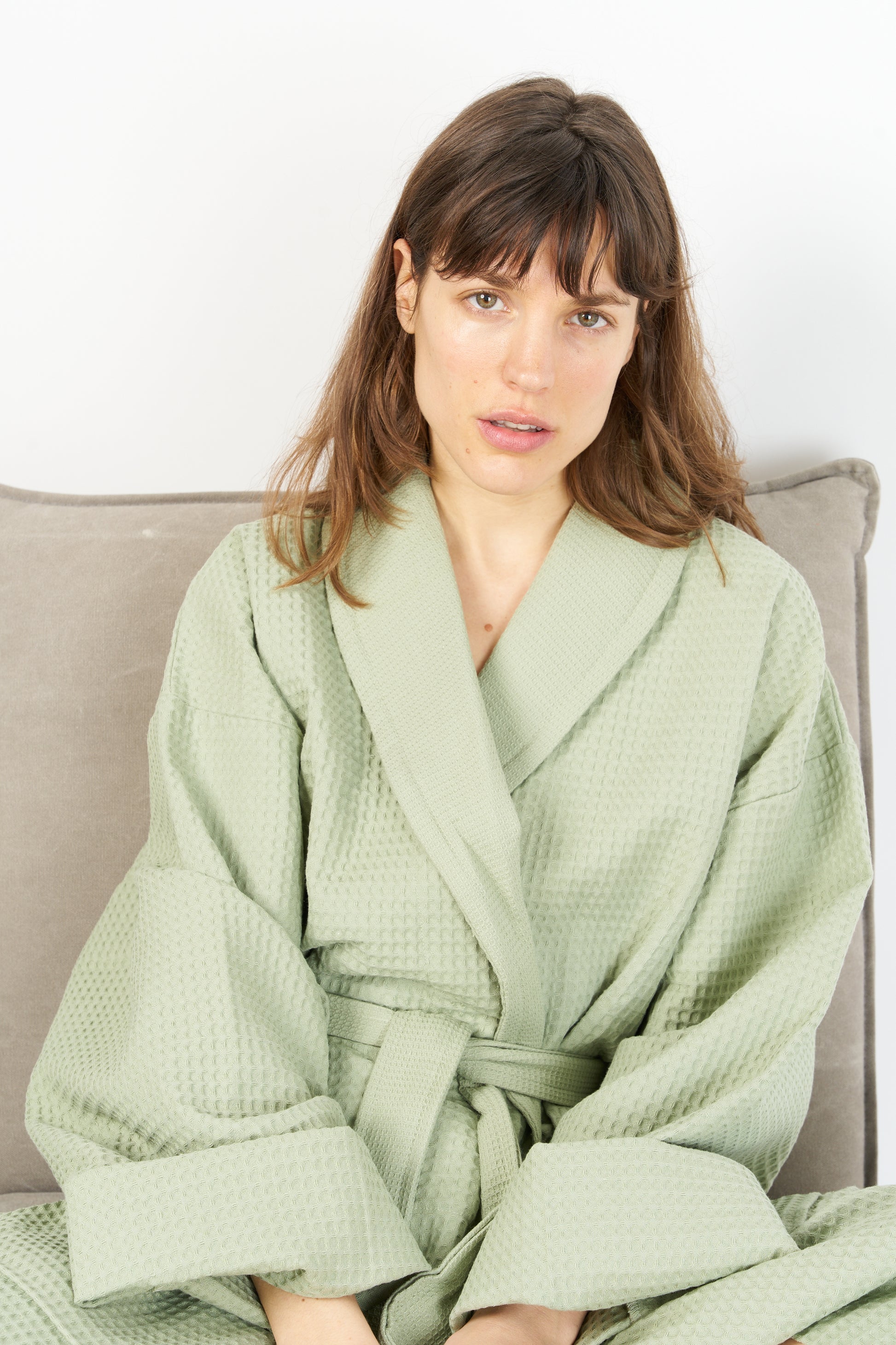 House Babylon’s waffle bathrobe is crafted from organic Turkish cotton and are Oeko-Tex certified to be fully free of any harmful chemicals. The waffle bathrobe is lightweight, softly textured and woven at 230 grams per square meter. This unisex bathrobe offers a relaxed fit featuring a lapel, a removable belt and capacious pockets. Made in Egypt.