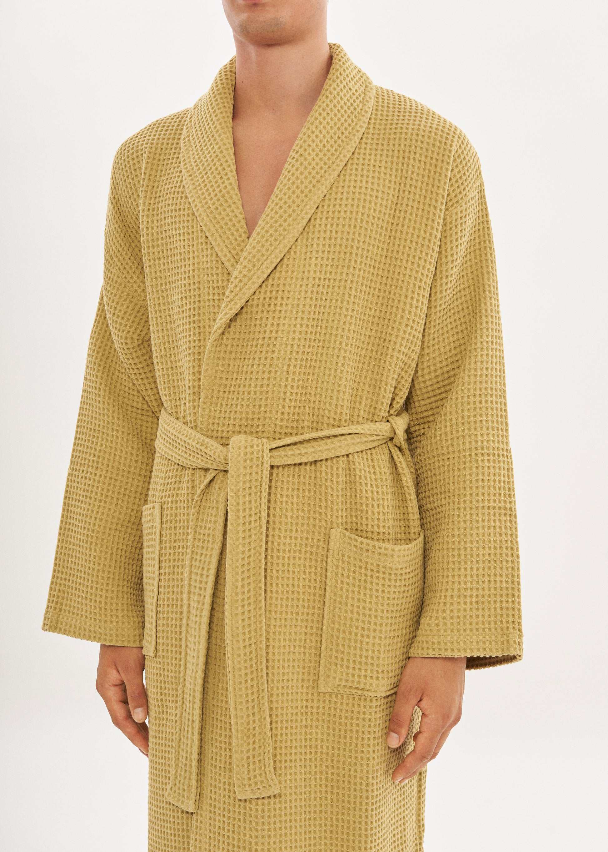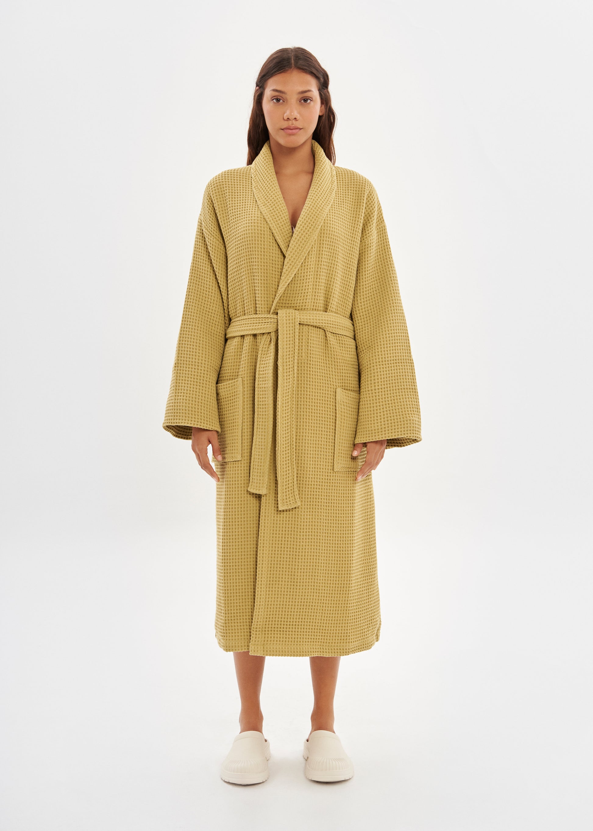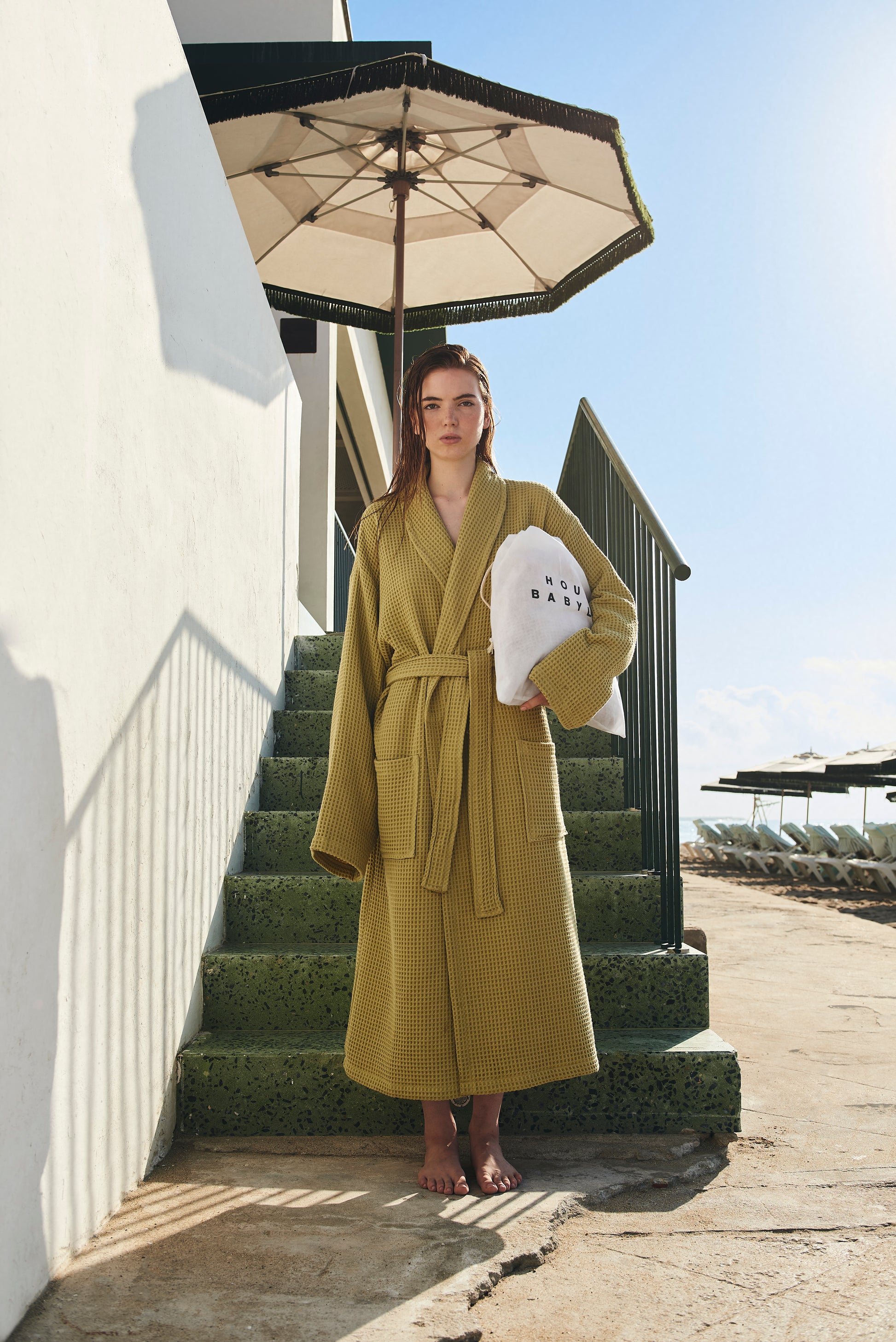 House Babylon’s waffle bathrobe is crafted from organic Turkish cotton and are Oeko-Tex certified to be fully free of any harmful chemicals. The waffle bathrobe is lightweight, softly textured and woven at 230 grams per square meter. This unisex bathrobe offers a relaxed fit featuring a lapel, a removable belt and capacious pockets. Made in Turkey.