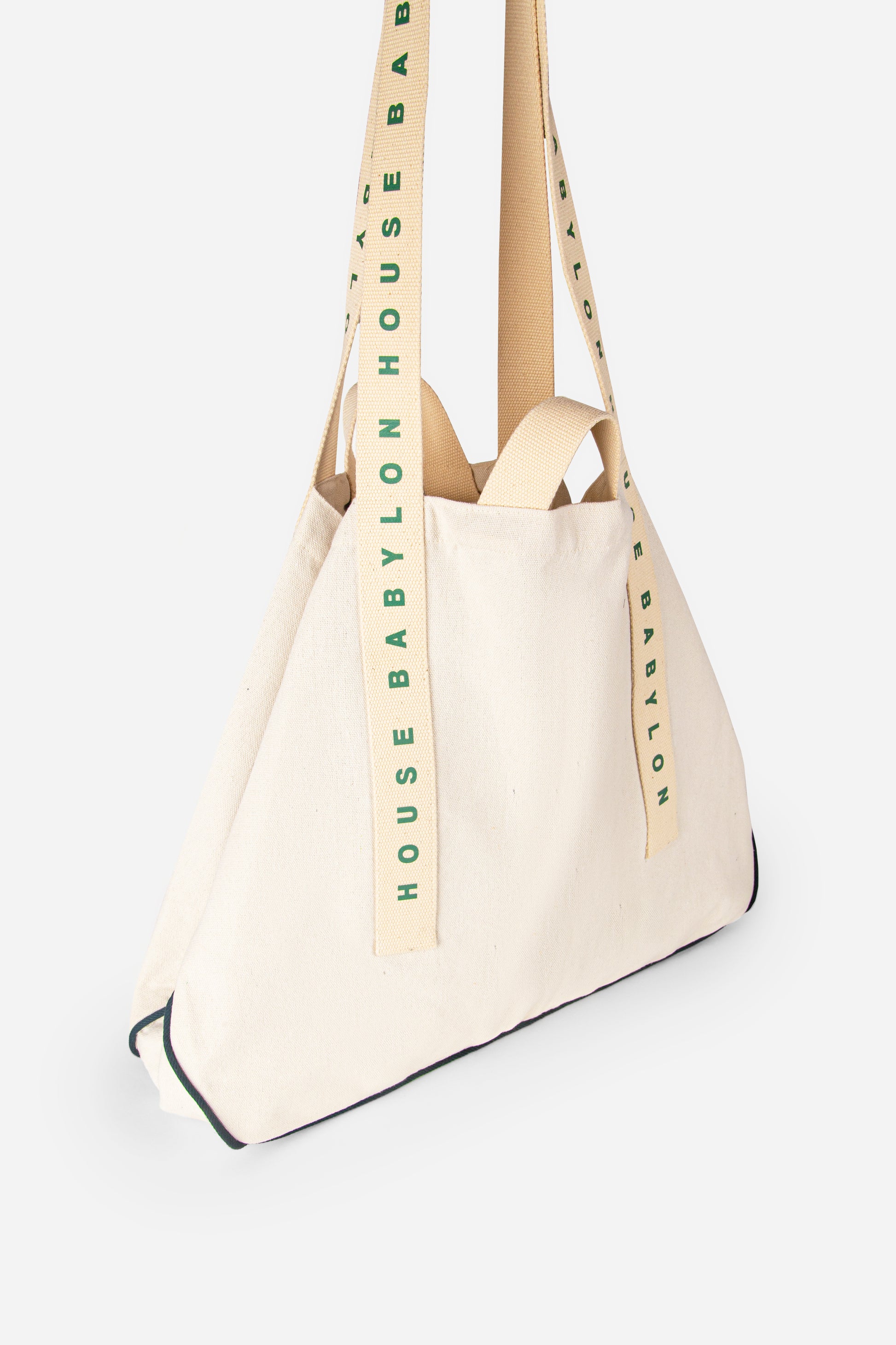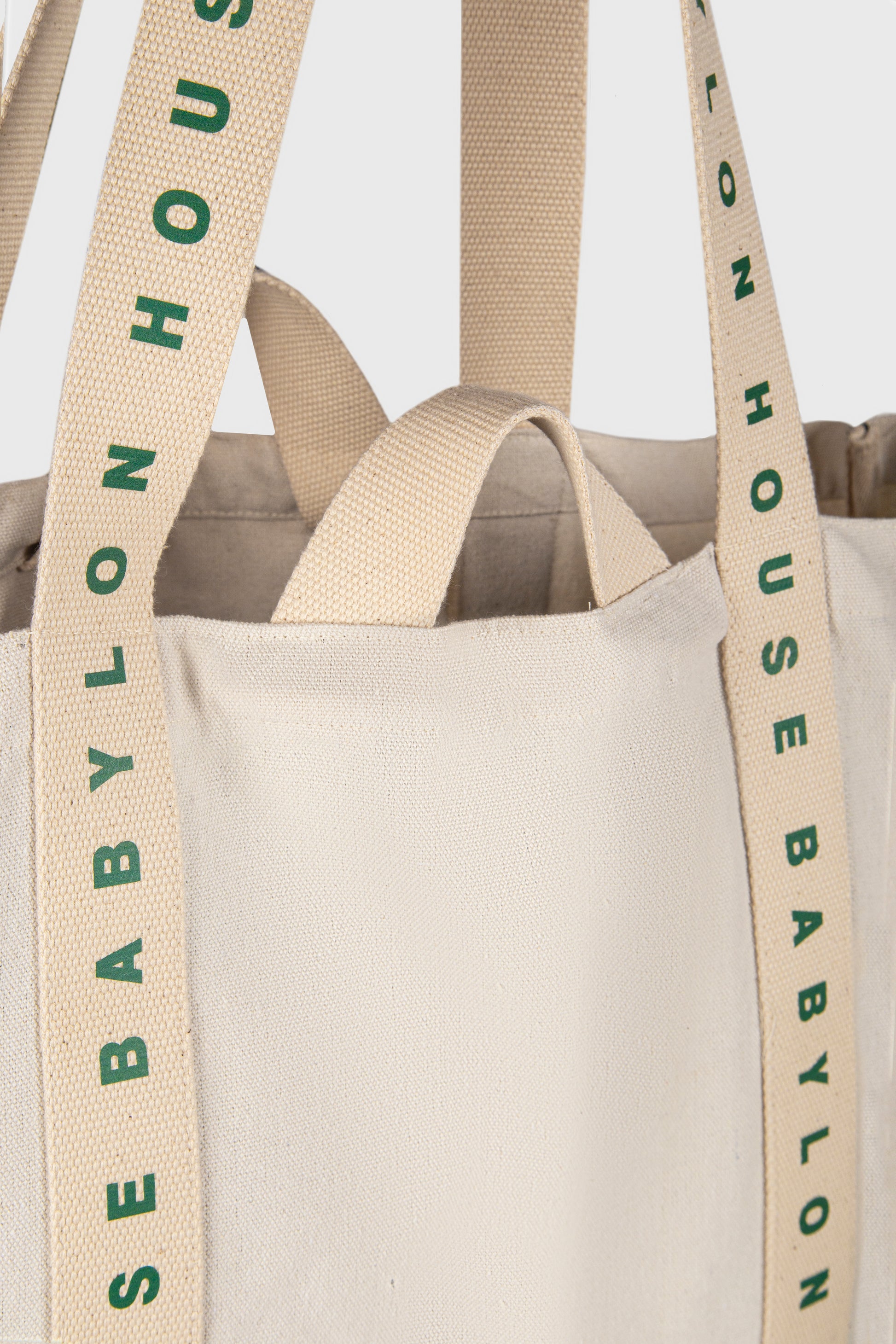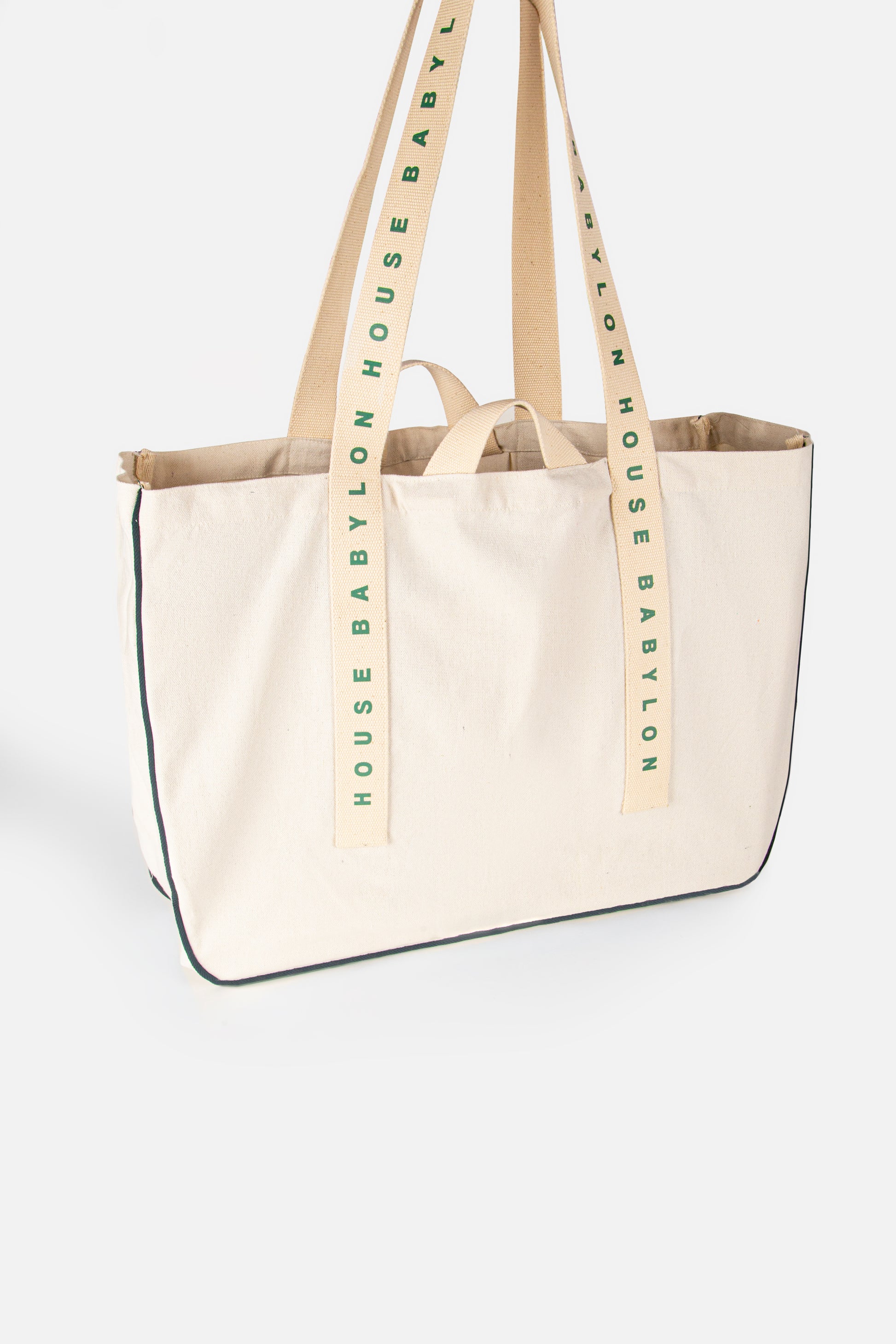 House Babylon's tote bags are crafted from thick, durable cotton canvas, featuring contrasting piping and an contrasted House Babylon logo.. Designed with top handles and an internal slip-zipped pocket to keep small items easily accessible, this tote is perfect for everyday use—whether carrying your trainers, gym wear, or daily essentials. It folds flat for effortless storage and travel convenience. Made in Egypt with exceptional attention to detail.