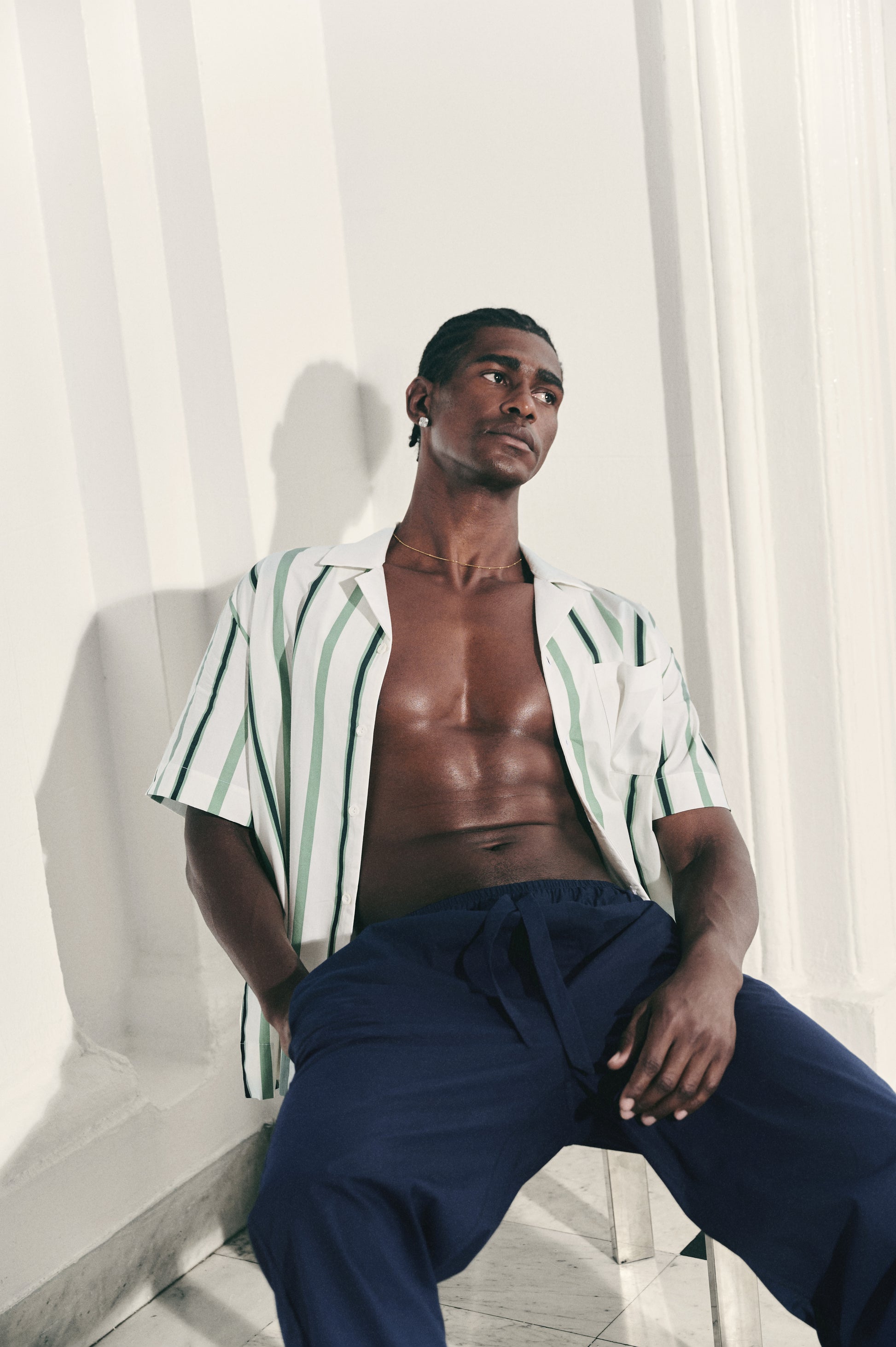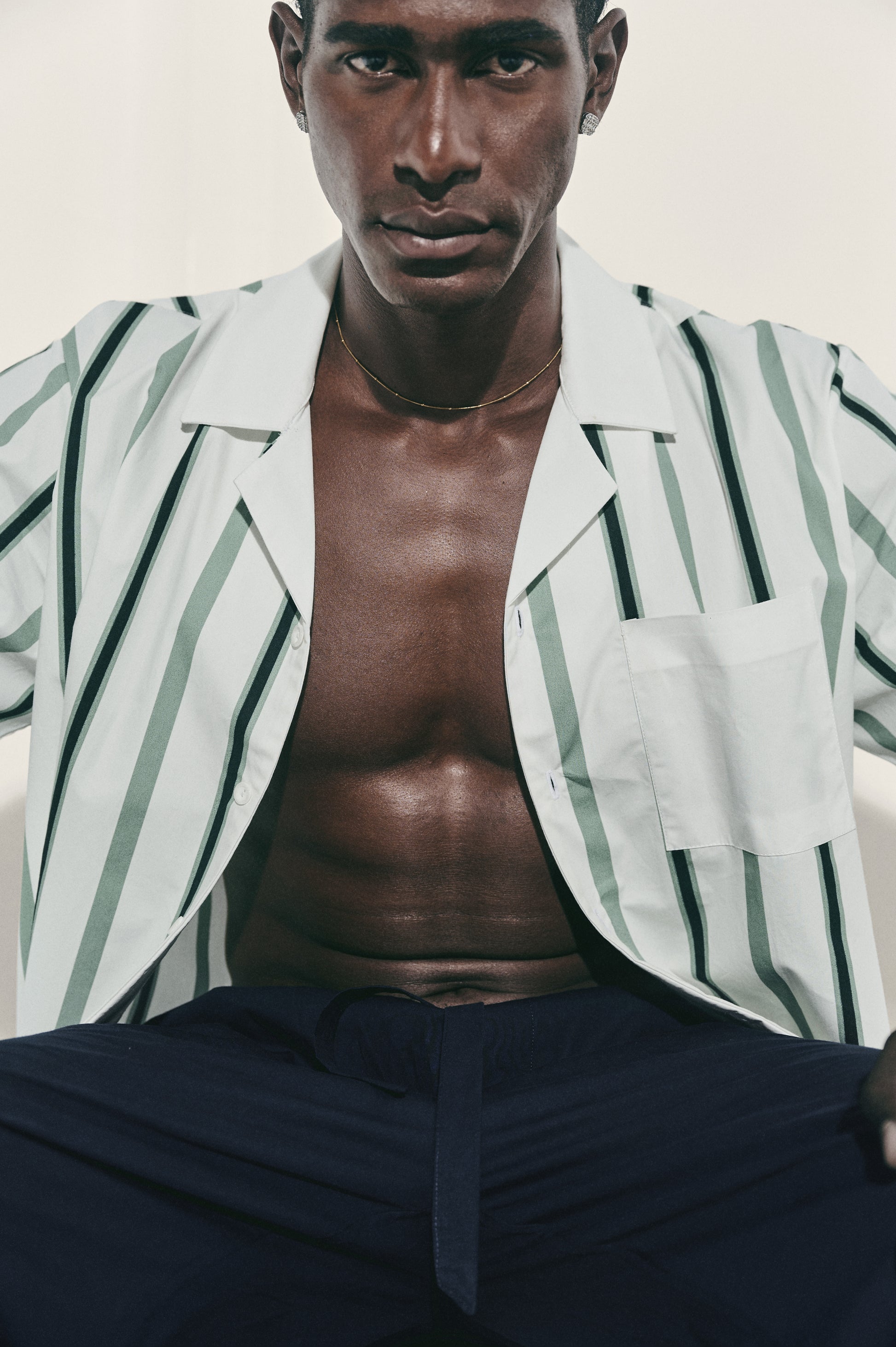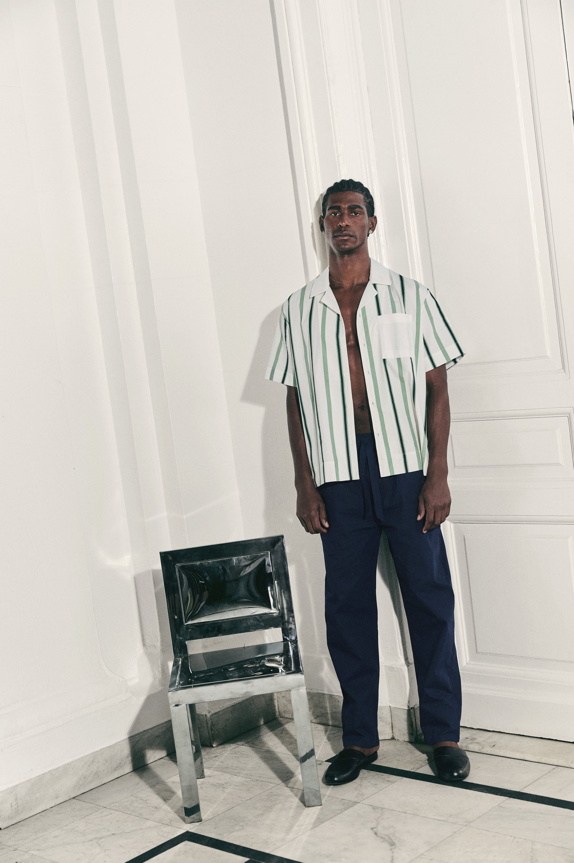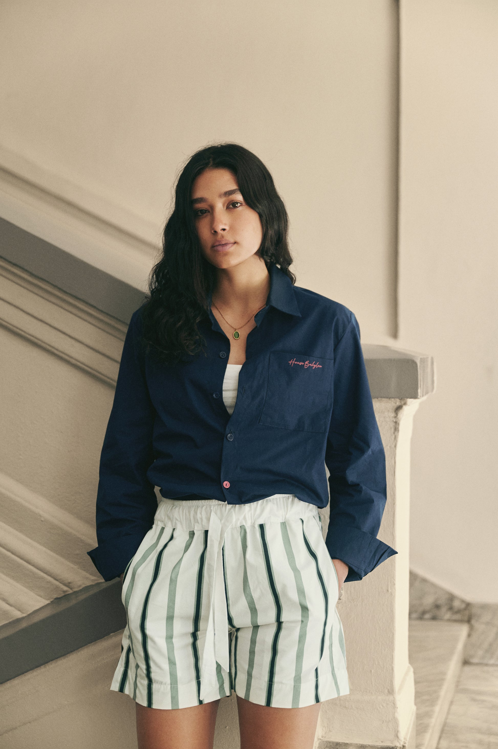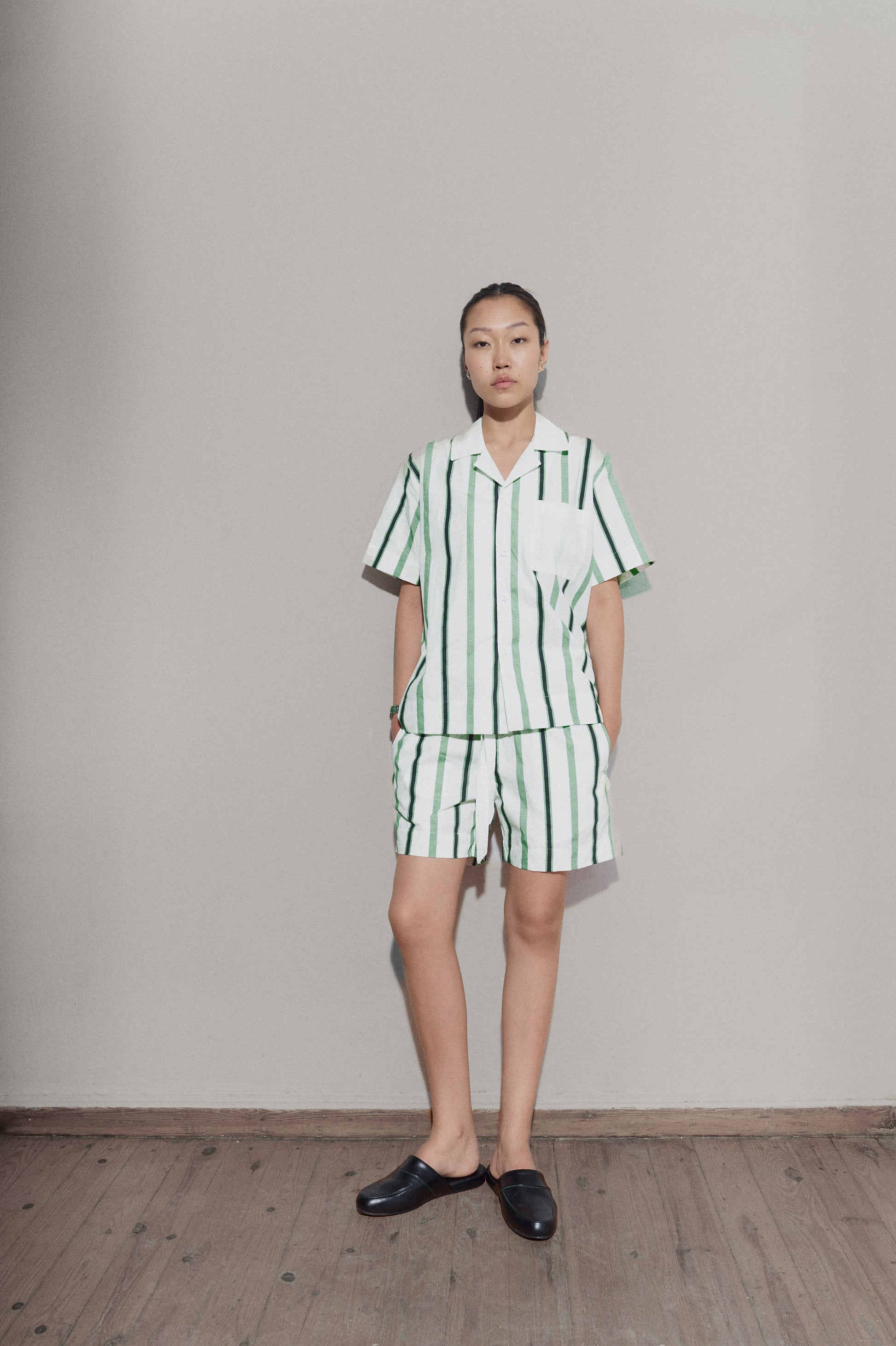 A summer uniform reimagined in breathable Egyptian cotton poplin. This set includes a short-sleeved shirt and tailored shorts, both cut for a relaxed fit that moves easily with you. The shirt features a soft spread collar, button closure, and a single chest pocket for subtle utility. The shorts are designed with short legs, an elastic waistband with tonal drawstring, discreet side pockets, and a single back pocket. Lightweight, easy to wear, and endlessly versatile, made for warm days at home or in the city. Made in Egypt.