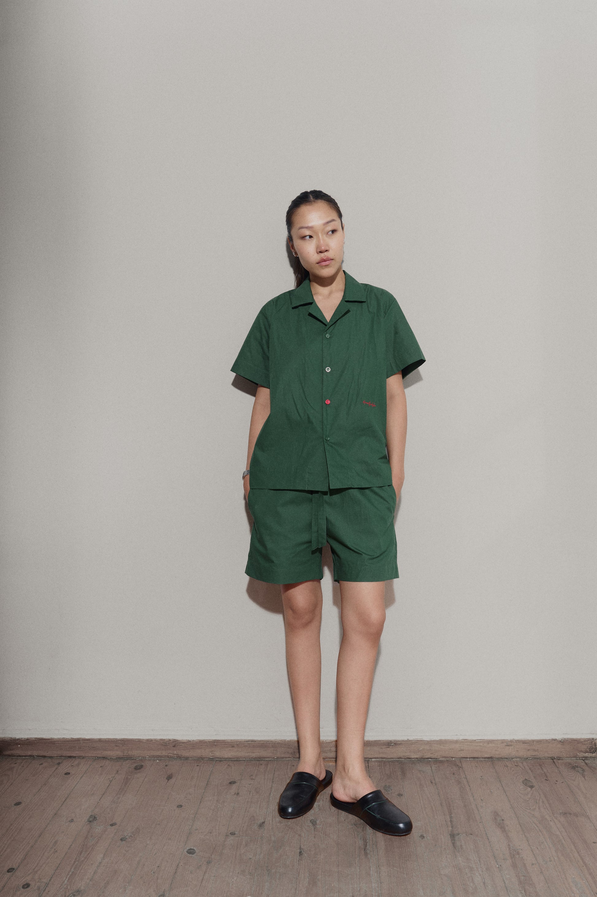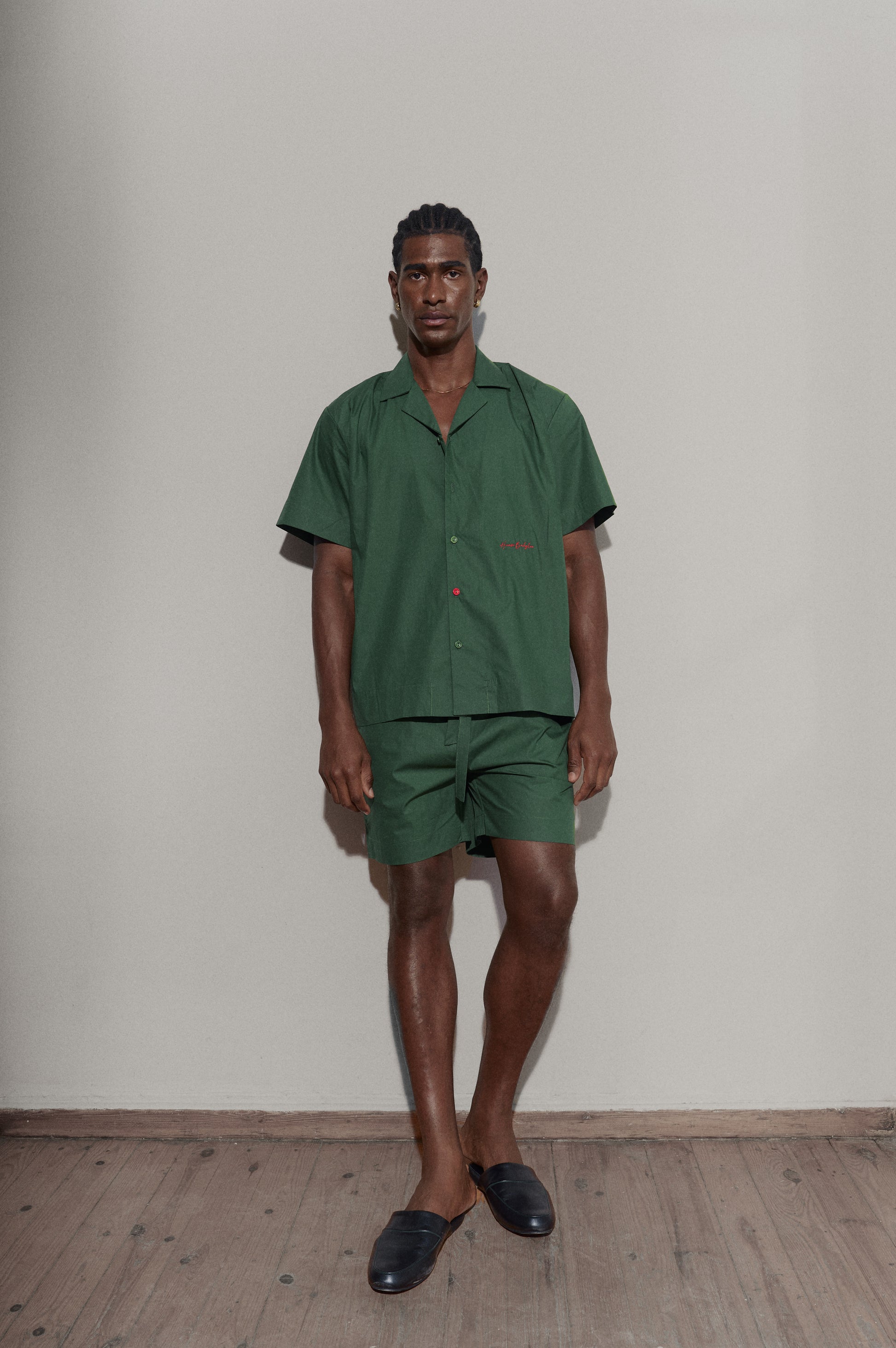 A summer uniform reimagined in breathable Egyptian cotton poplin. This set includes a short-sleeved shirt and tailored shorts, both cut for a relaxed fit that moves easily with you. The shirt features a soft spread collar, button closure, and a single chest pocket for subtle utility. The shorts are designed with short legs, an elastic waistband with tonal drawstring, discreet side pockets, and a single back pocket. Lightweight, easy to wear, and endlessly versatile, made for warm days at home or in the city. Made in Egypt.