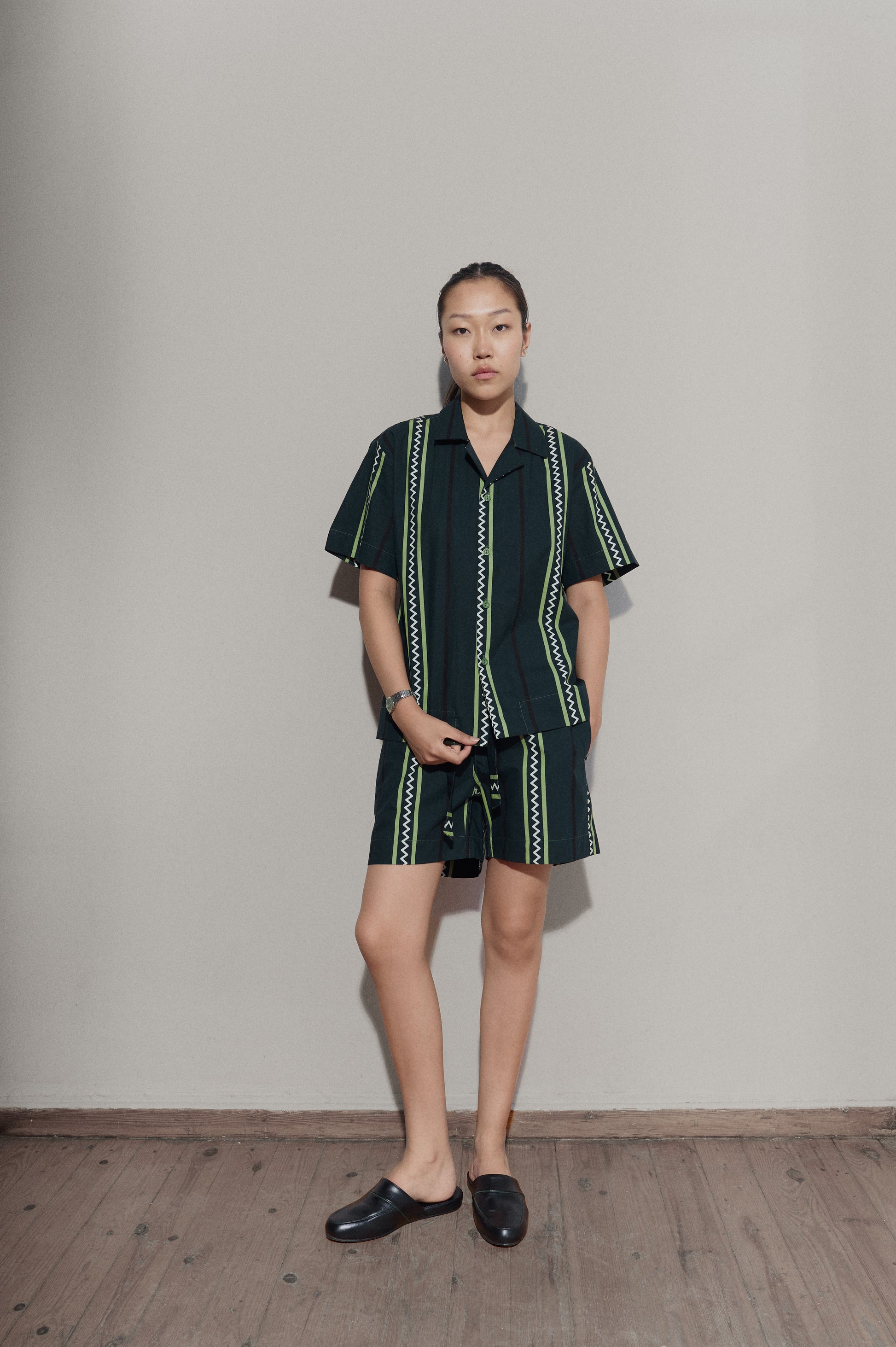A summer uniform reimagined in breathable Egyptian cotton poplin. This set includes a short-sleeved shirt and tailored shorts, both cut for a relaxed fit that moves easily with you. The shirt features a soft spread collar, button closure, and a single chest pocket for subtle utility. The shorts are designed with short legs, an elastic waistband with tonal drawstring, discreet side pockets, and a single back pocket. Lightweight, easy to wear, and endlessly versatile, made for warm days at home or in the city. Made in Egypt.