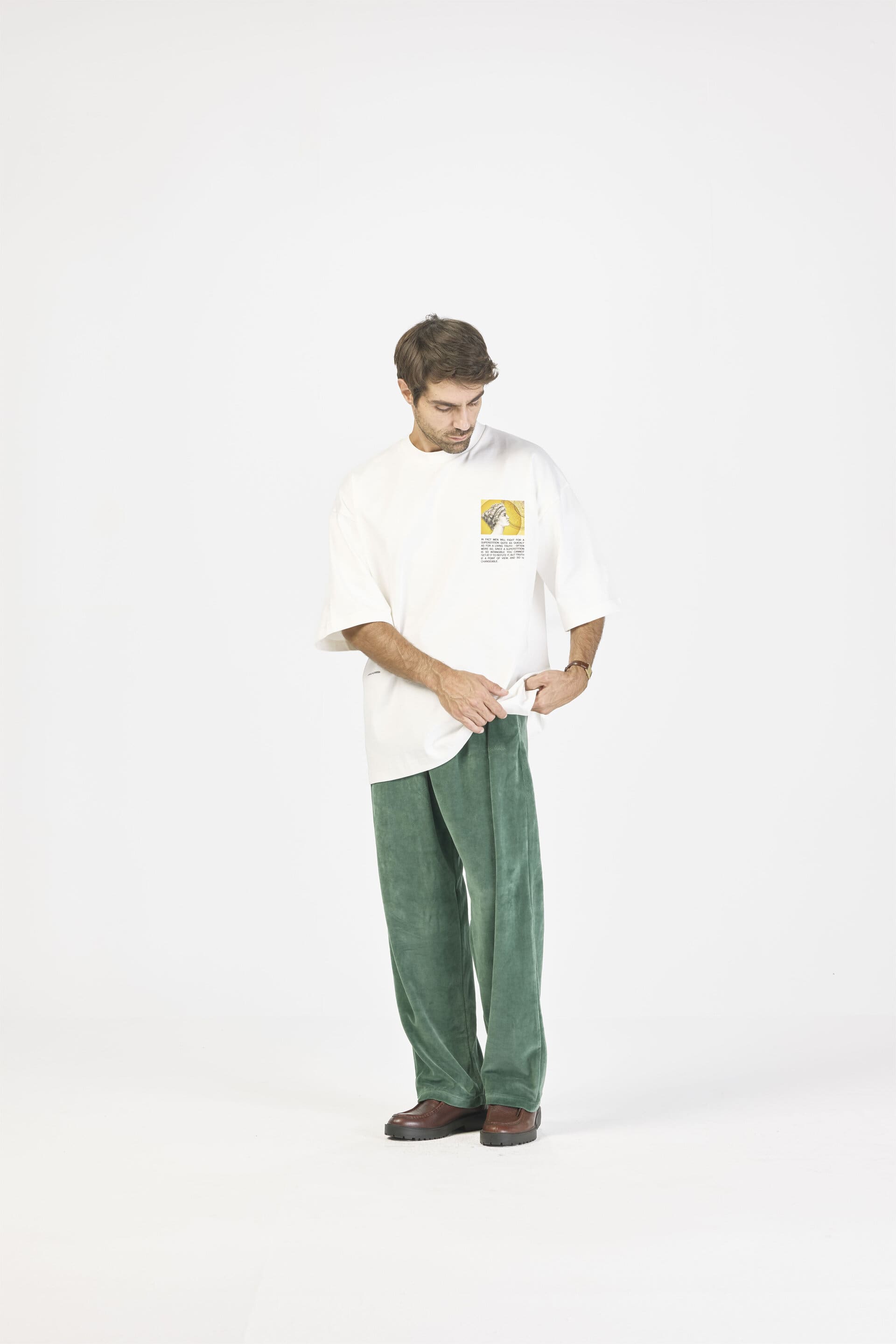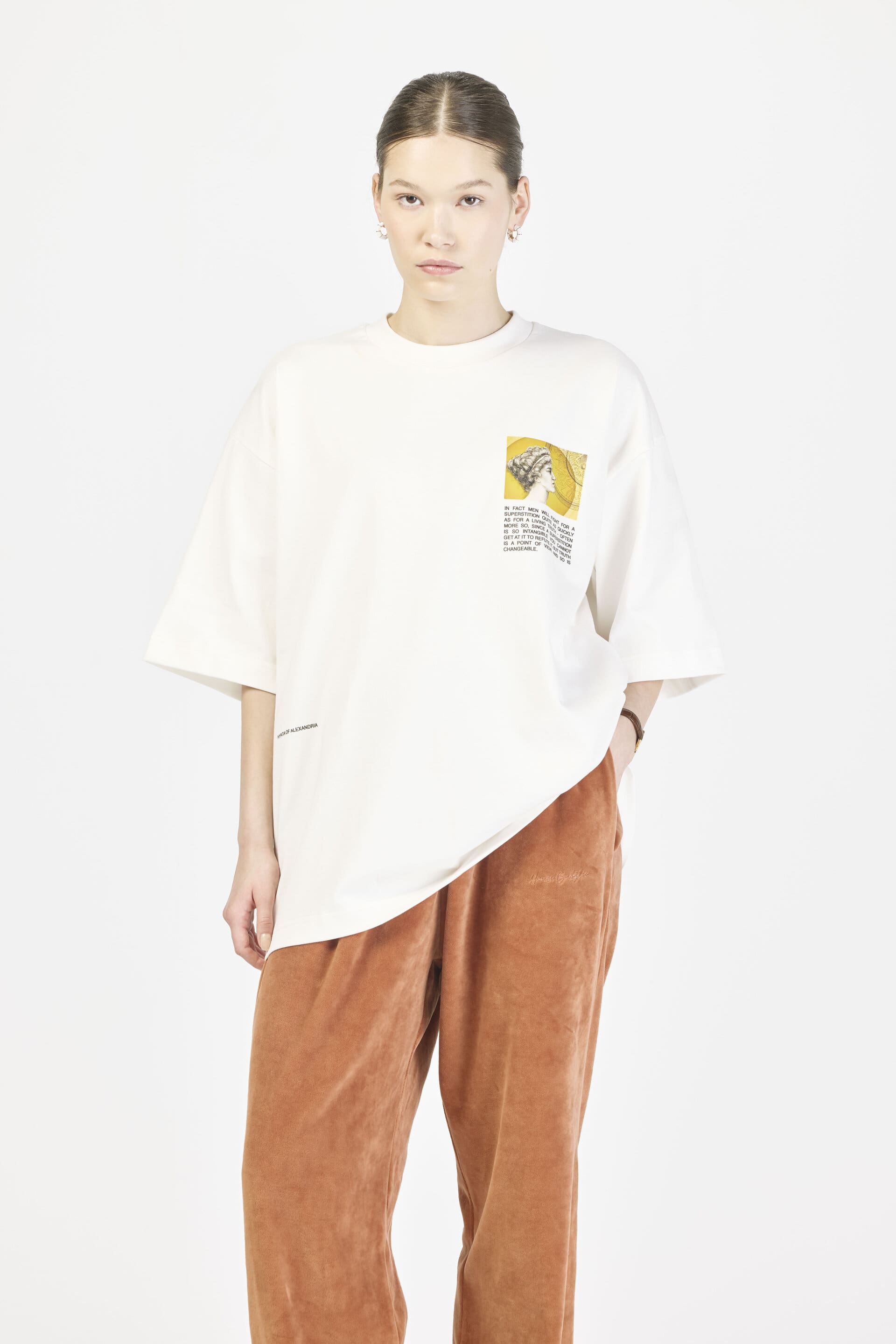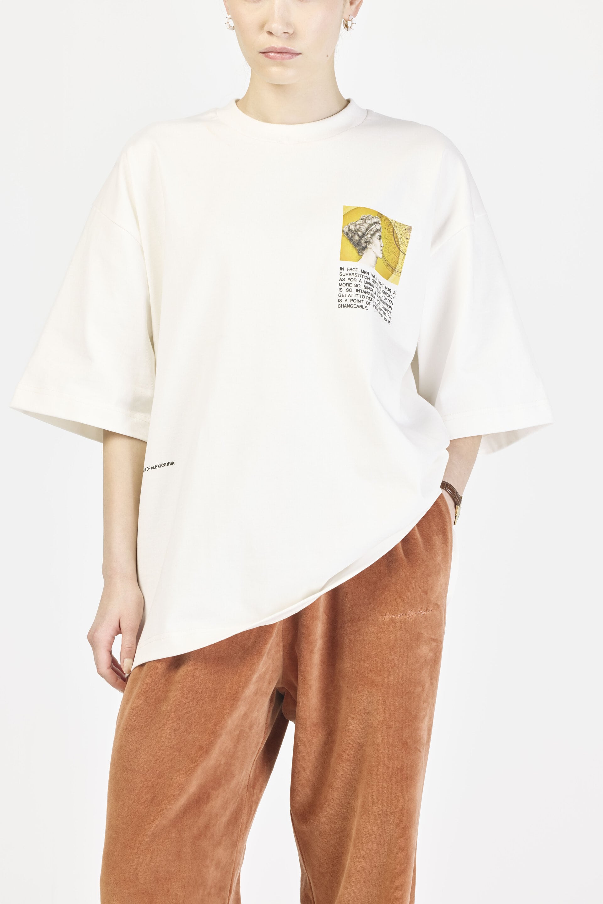The Hypatia t-shirt is a 260g heavyweight, relaxed t-shirt outlined by a classic crewneck and short sleeves. It features a cotton interlock knit with a matte handfeel, making it highly durable while remaining soft and breathable. On the chest, a picture of Hypatia print and quote is in honor of the great mathematician of Alexandria.