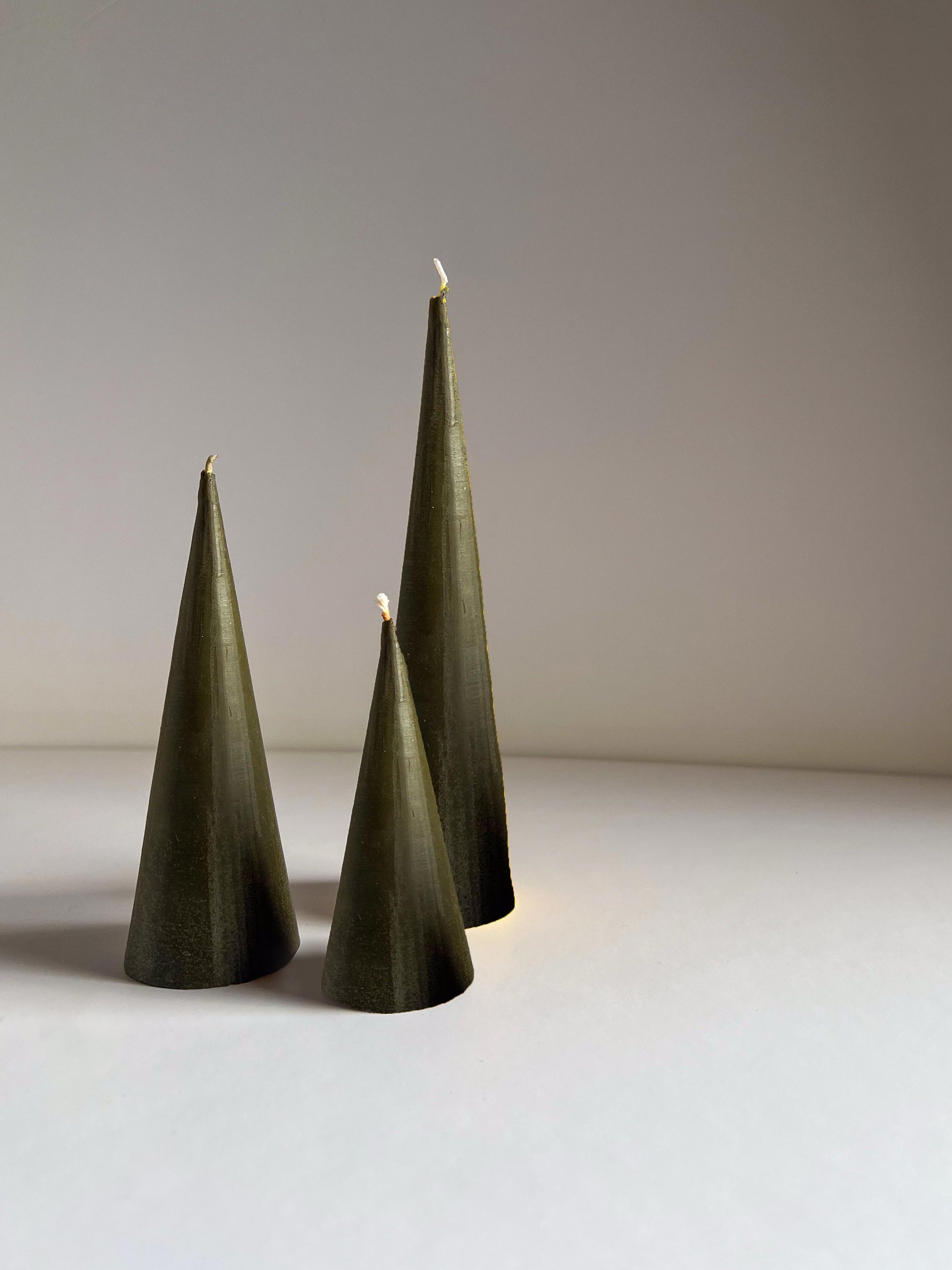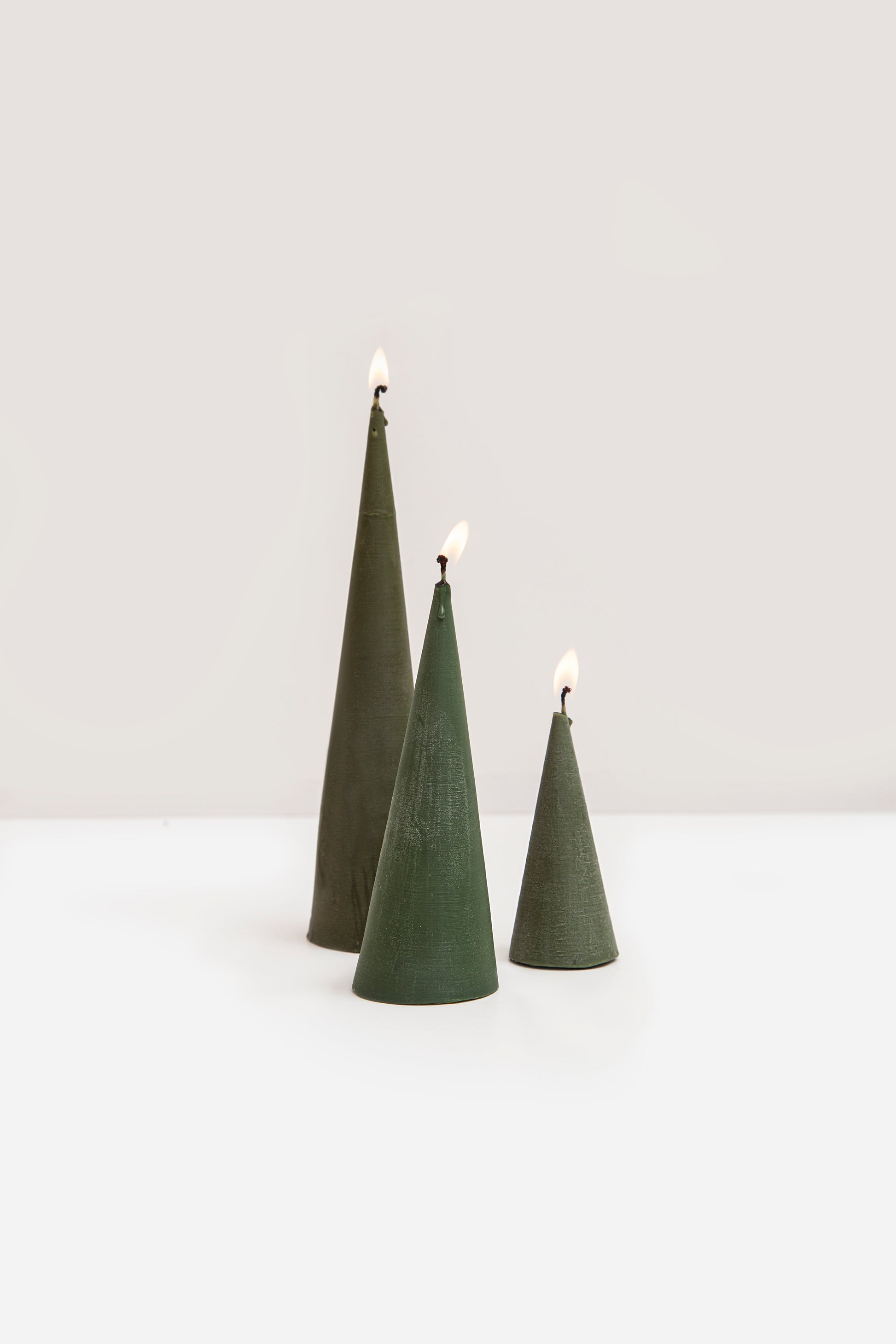 The Trio Cone Candles are hand-poured in sculptural cone shapes, inspired by the Labbadeh — a traditional, conical, brimless felt cap worn in Lebanon. With their solid form and playful silhouette, these candles bring a modern, decorative edge to any space — a contemporary take on the classic taper.