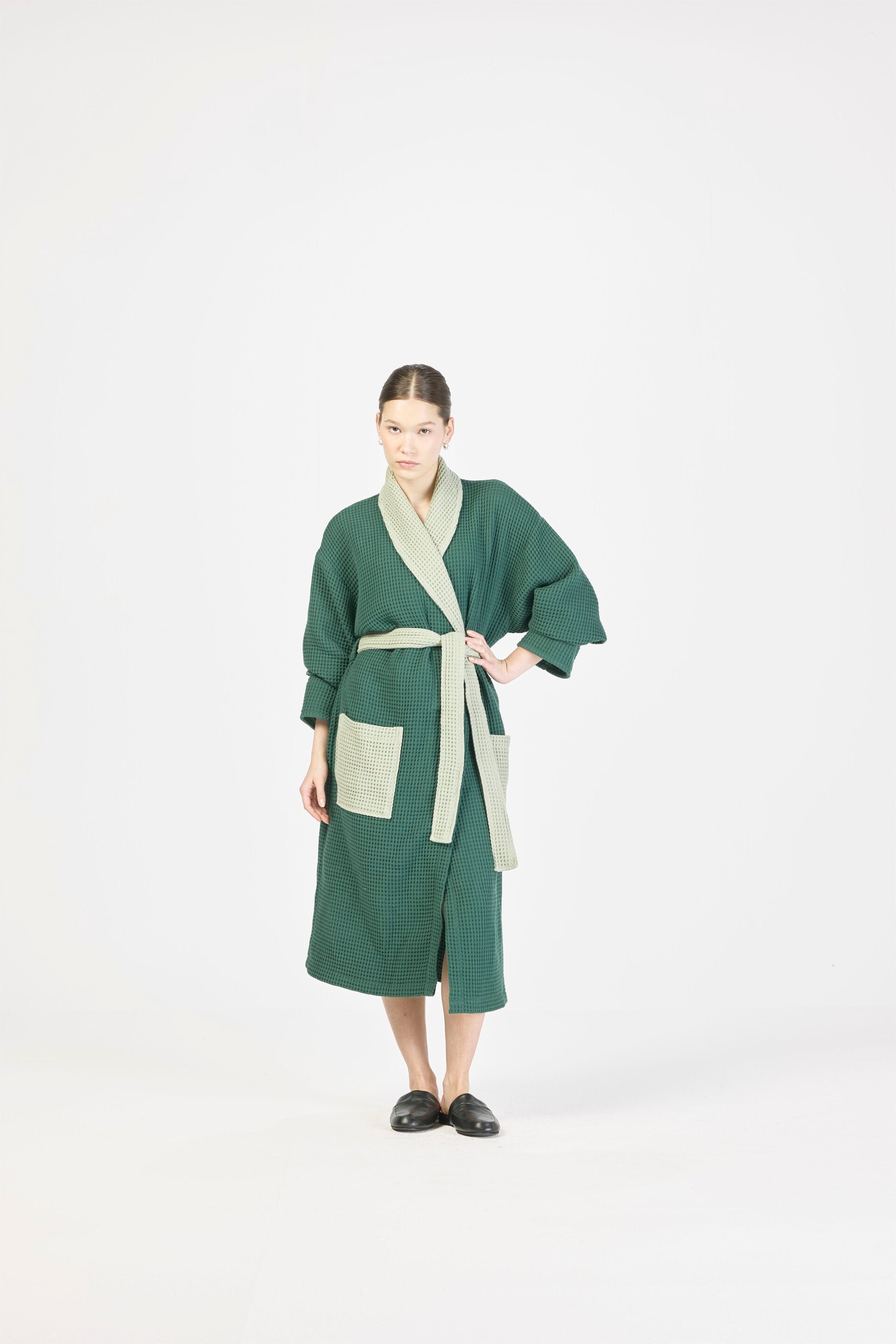House Babylon’s two toned waffle bathrobe is crafted from organic Turkish cotton and is Oeko-Tex certified to be fully free of any harmful chemicals. The waffle bathrobe is lightweight, softly textured and woven at 230 grams per square meter. This unisex bathrobe offers a relaxed fit featuring a lapel and capacious pockets. Made in Turkey.