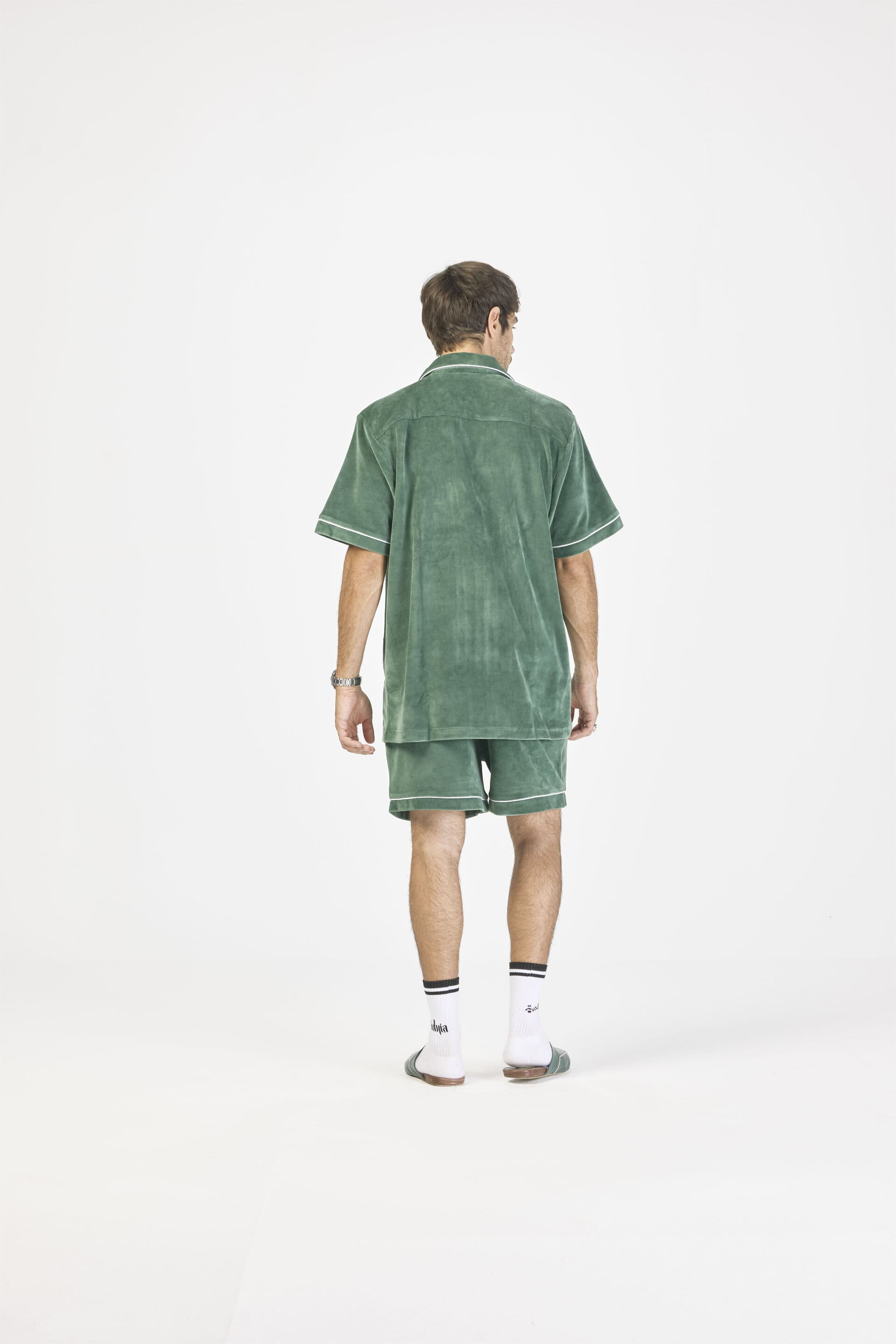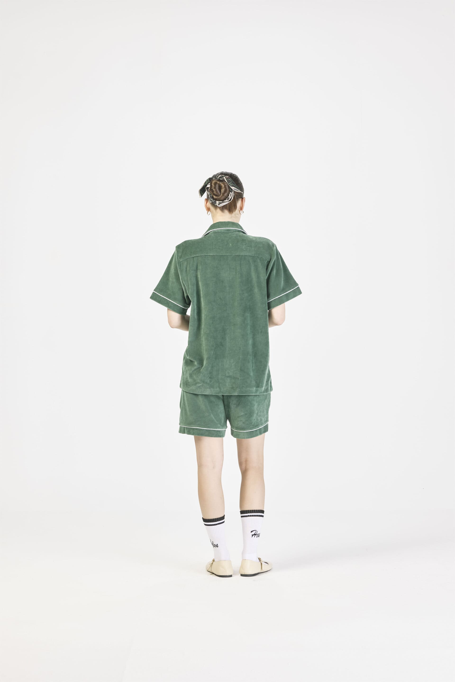 Made from ultra-soft velour-knit fabric, this shirt features a pointed collar, buttoned placket, embroidered chest pocket, and piping details. It pairs perfectly with the matching velour shorts for a complete look.