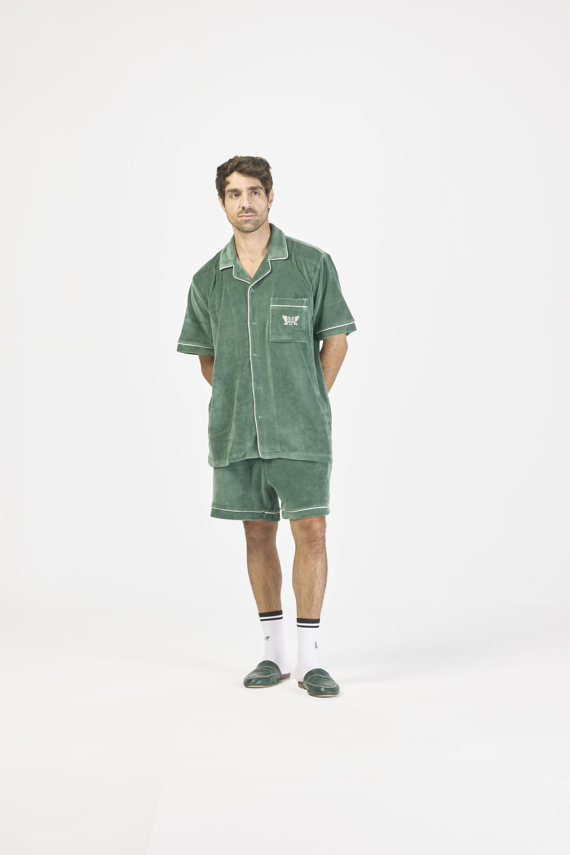 Made from ultra-soft velour-knit fabric, this shirt features a pointed collar, buttoned placket, embroidered chest pocket, and piping details. It pairs perfectly with the matching velour shorts for a complete look.