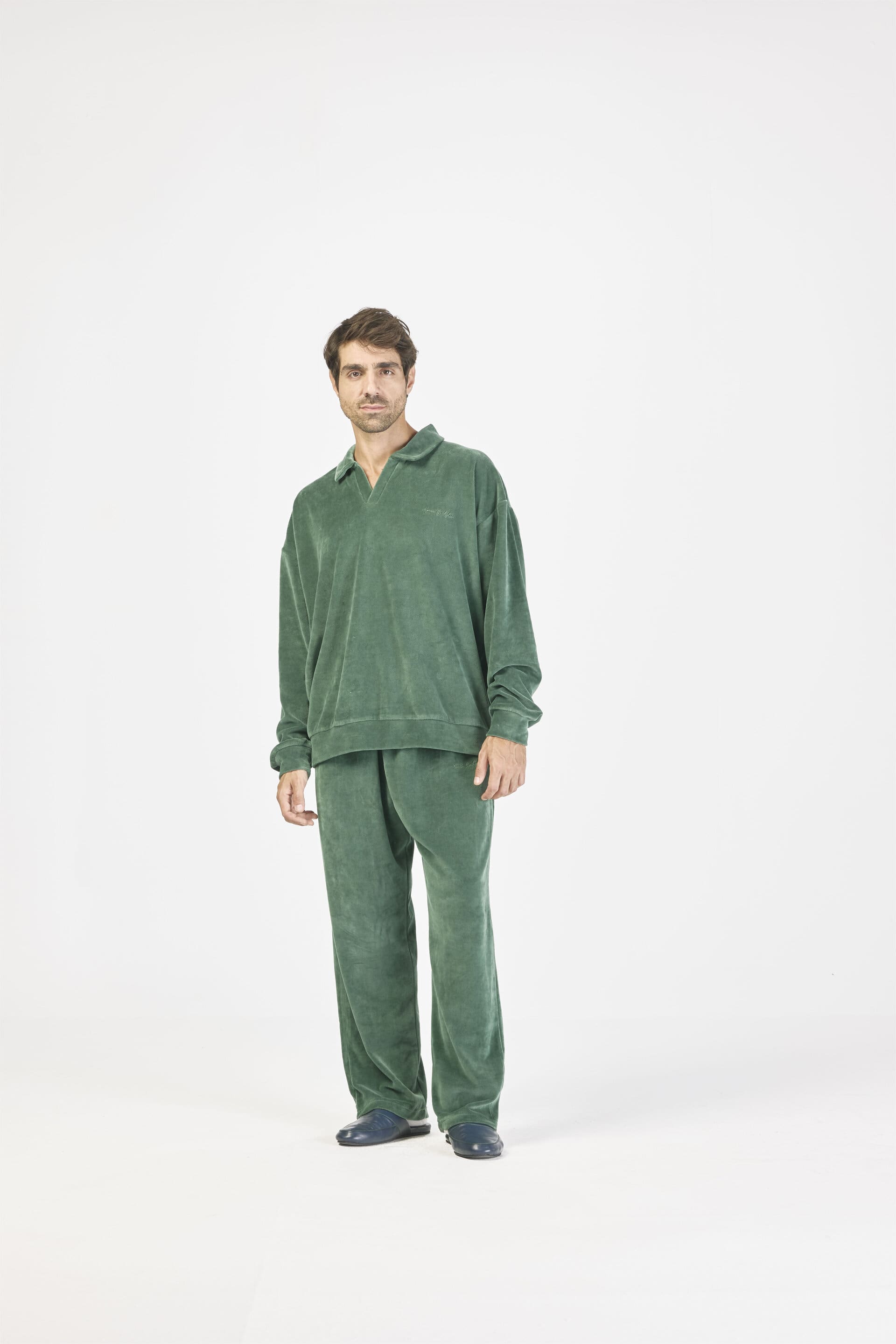 This long-sleeve sweatshirt is crafted from soft velour-knit fabric and features a polo collar, embroidered chest logo, and self-fabric cuffs and hemline. It is designed with a relaxed fit for comfort and pairs well with the matching velour trousers.