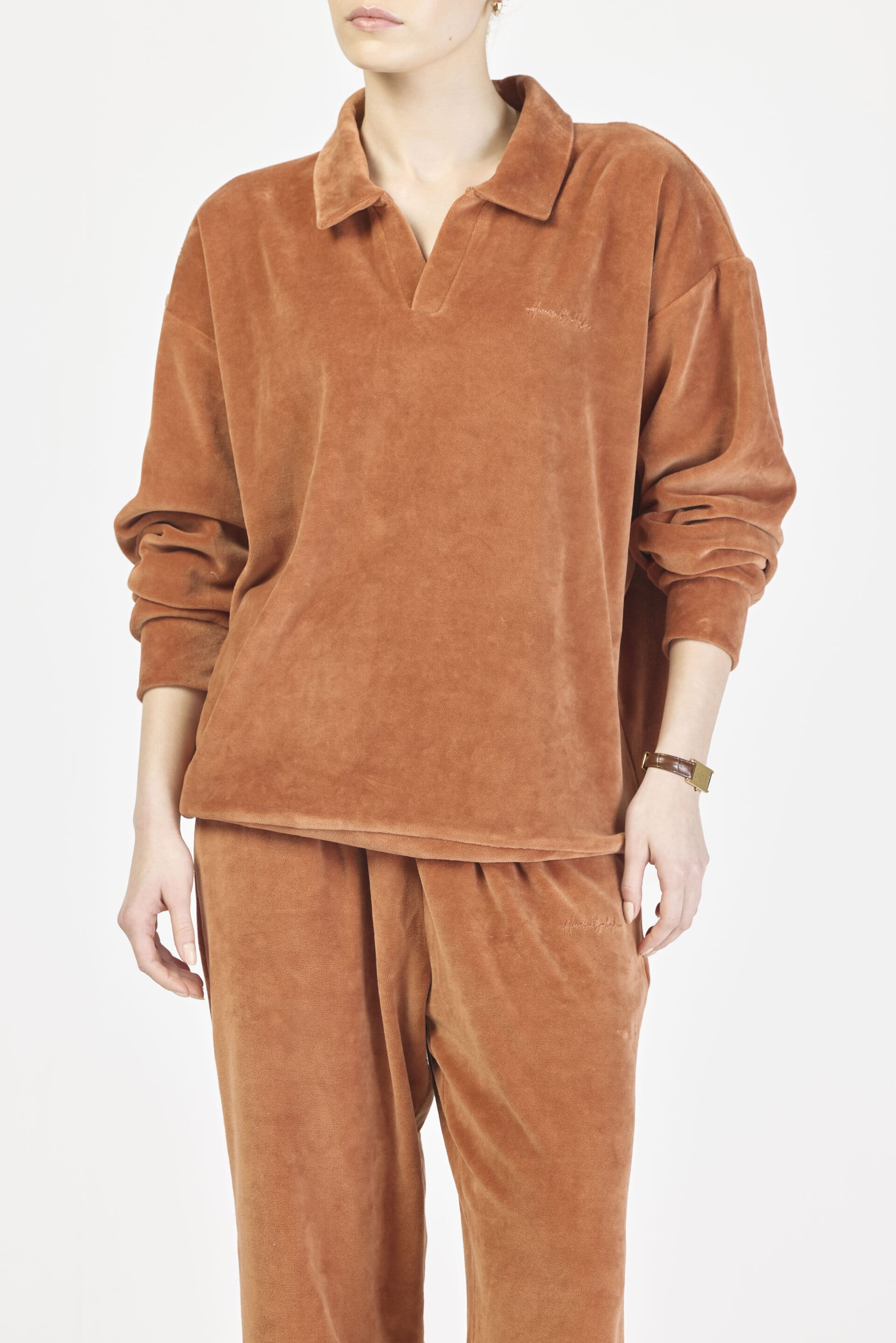 This long-sleeve sweatshirt is crafted from soft velour-knit fabric and features a polo collar, embroidered chest logo, and self-fabric cuffs and hemline. It is designed with a relaxed fit for comfort and pairs well with the matching velour trousers.