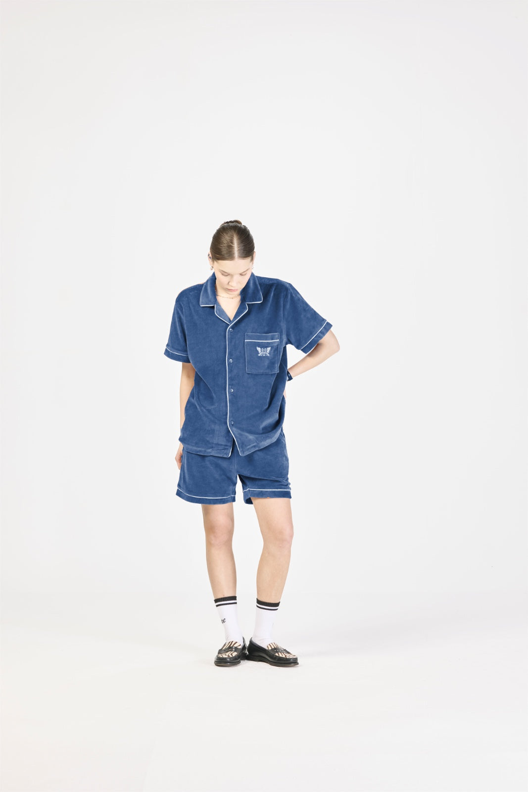 Made from ultra-soft velour-knit fabric, this shirt features a pointed collar, buttoned placket, embroidered chest pocket, and piping details. It pairs perfectly with the matching velour shorts for a complete look.