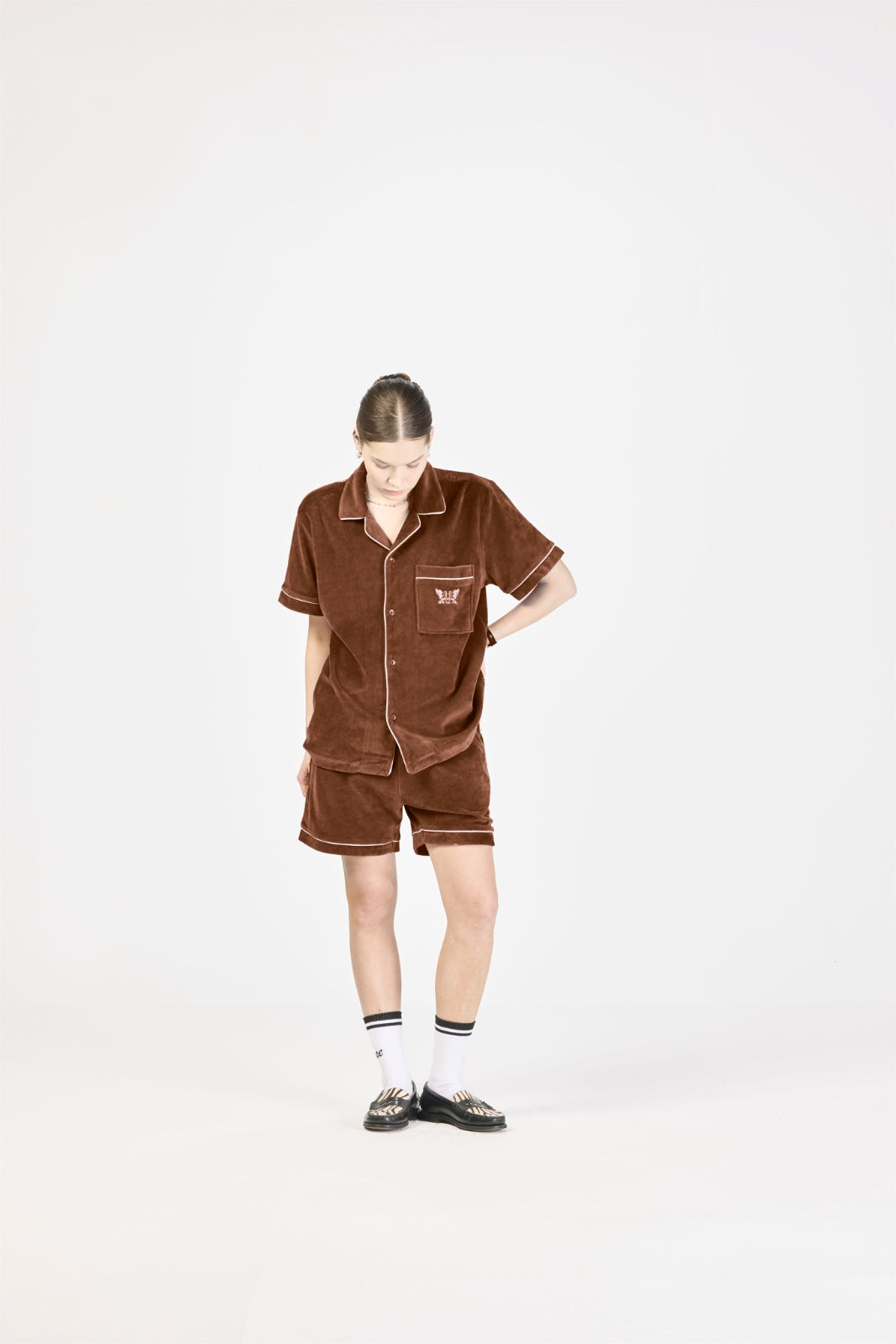 These velour shorts are made from soft velour-knit fabric and feature an elasticized drawstring waistband, side pockets, and piping details. A chest patch pocket with chicken embroidery adds a playful element. Pair them with the matching velour shirt for a complete set.