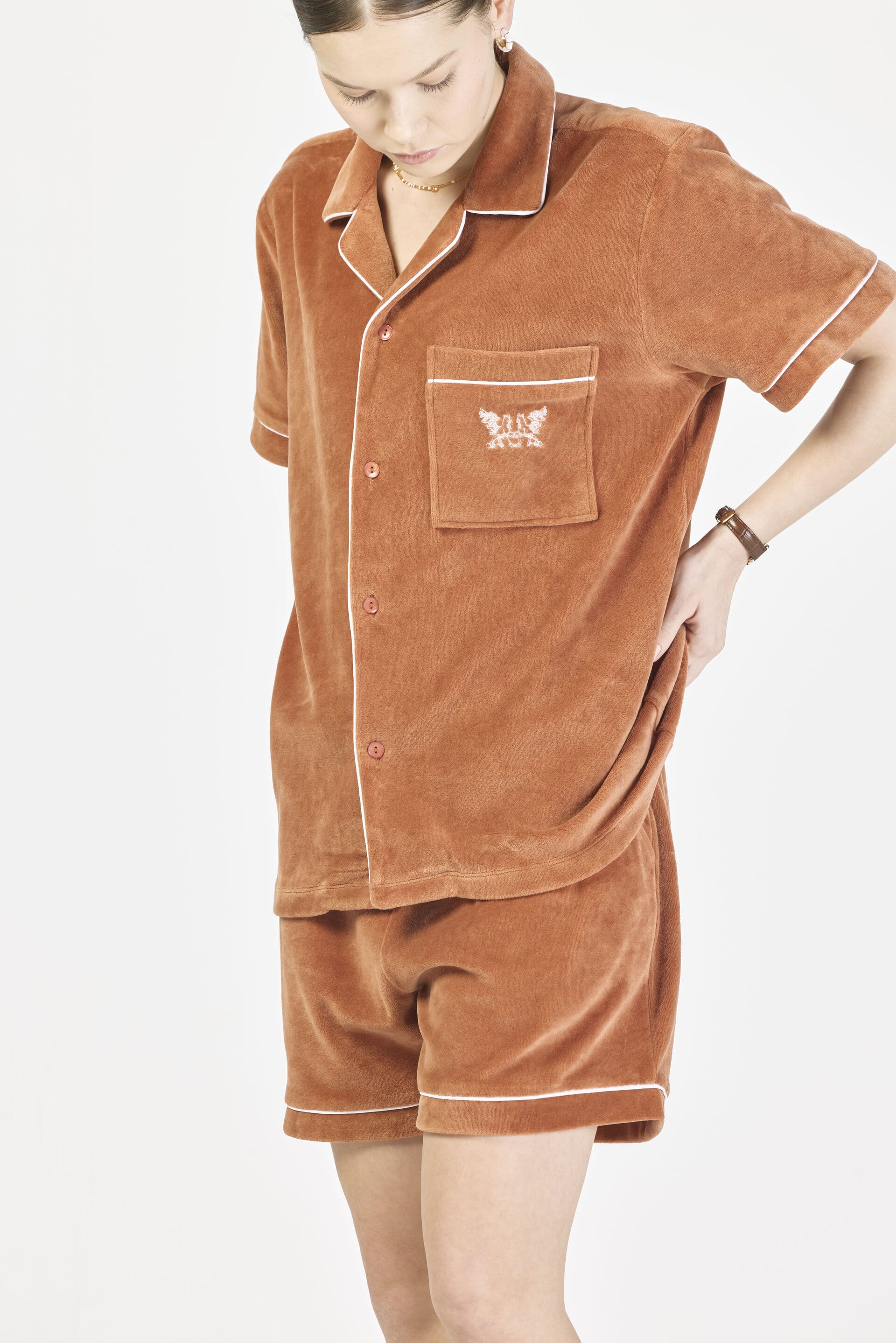 These velour shorts are made from soft velour-knit fabric and feature an elasticized drawstring waistband, side pockets, and piping details. A chest patch pocket with chicken embroidery adds a playful element. Pair them with the matching velour shirt for a complete set.