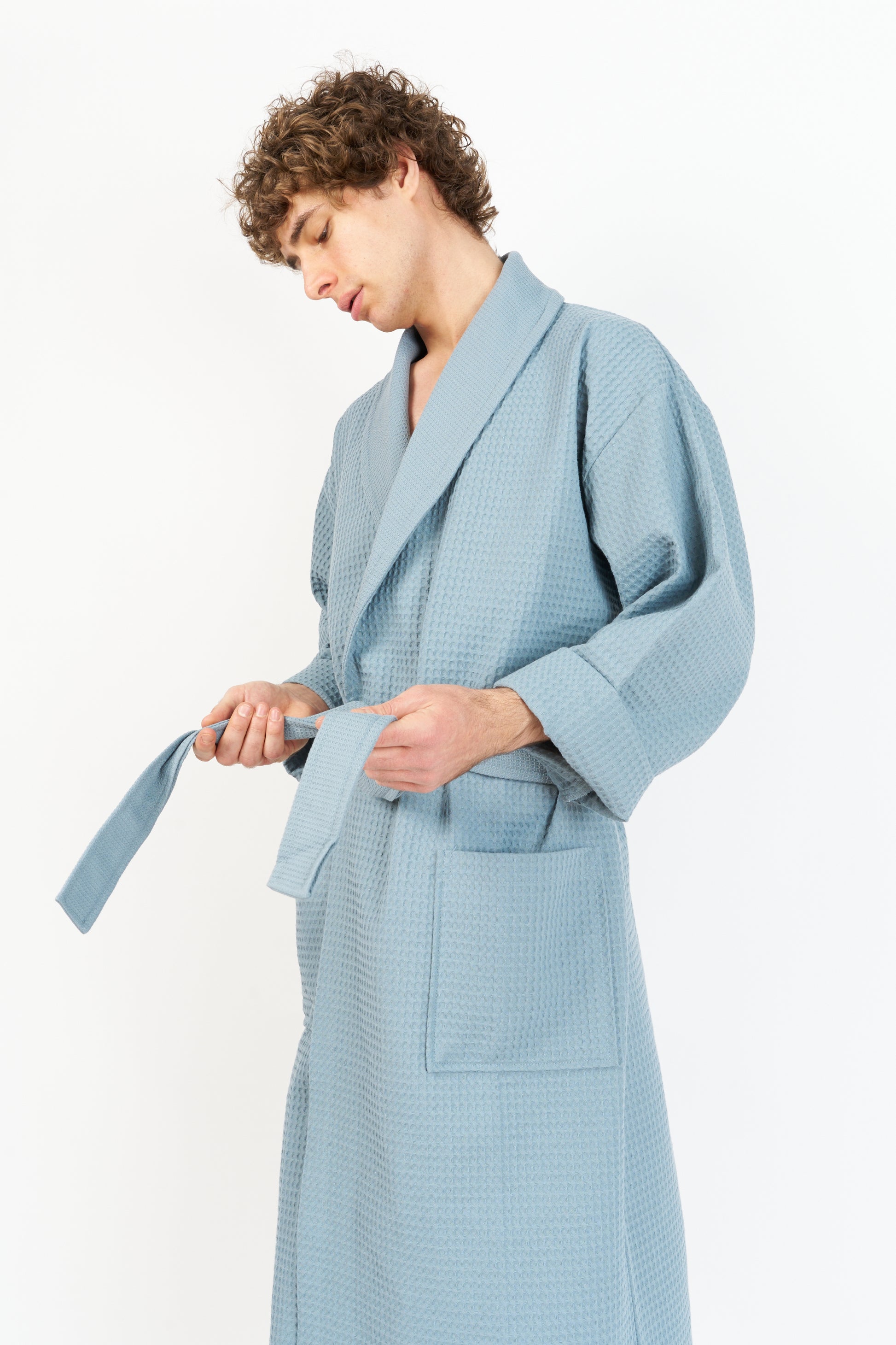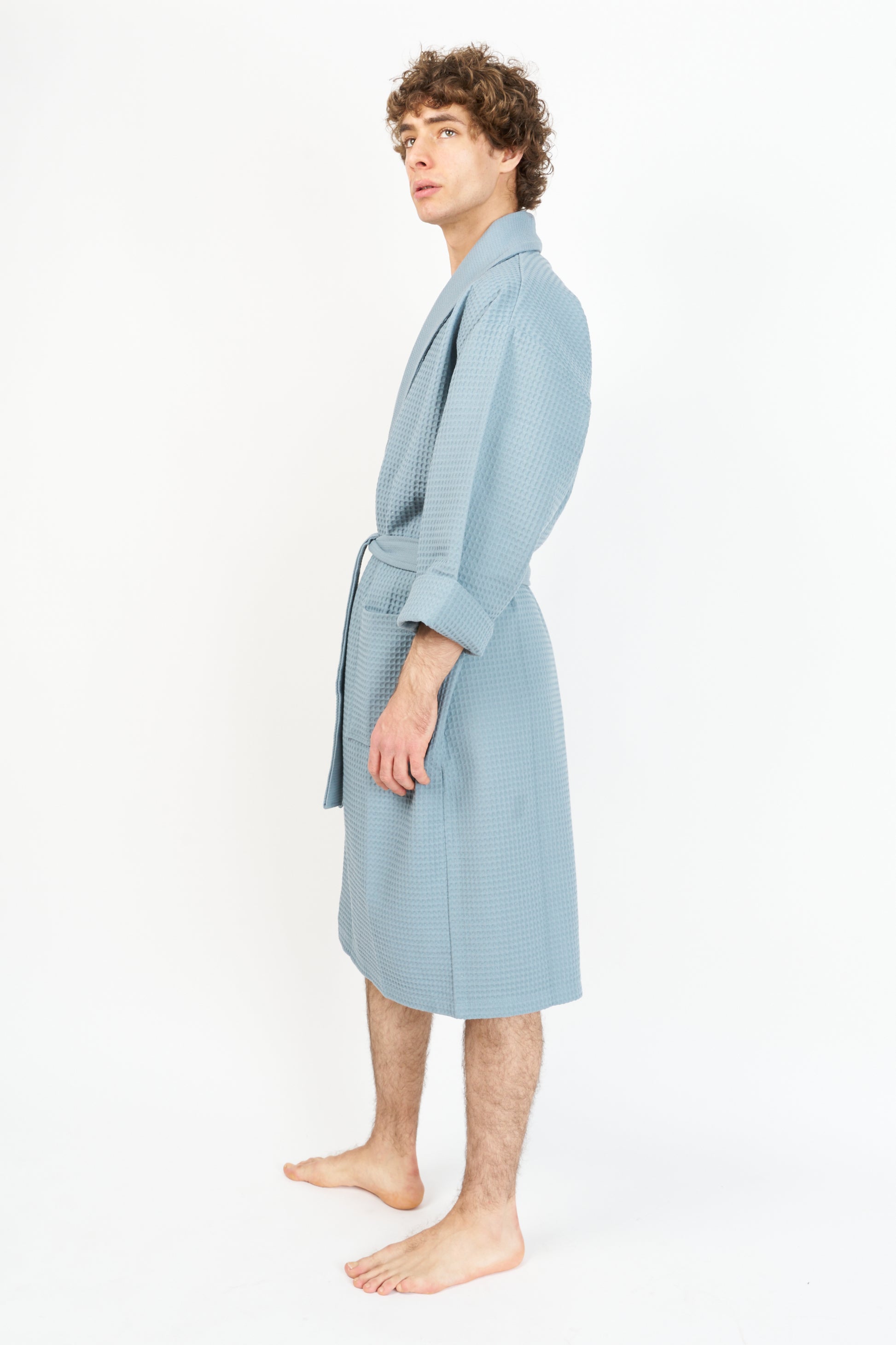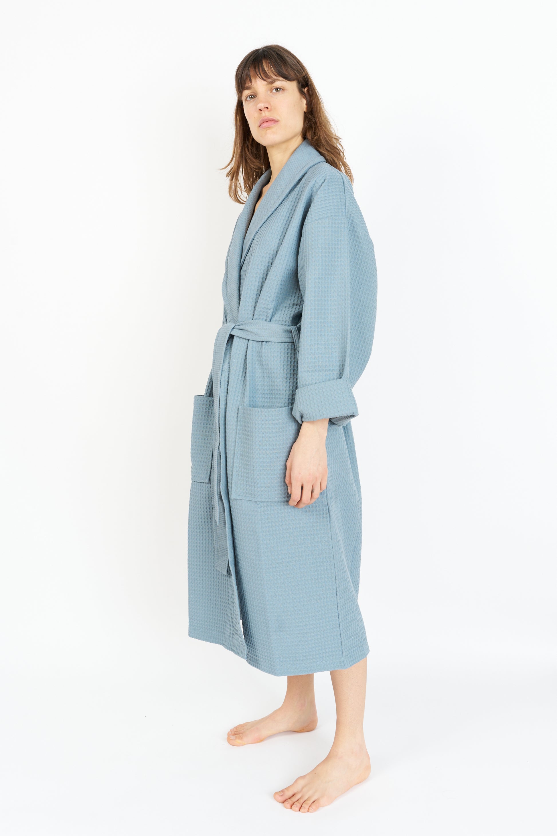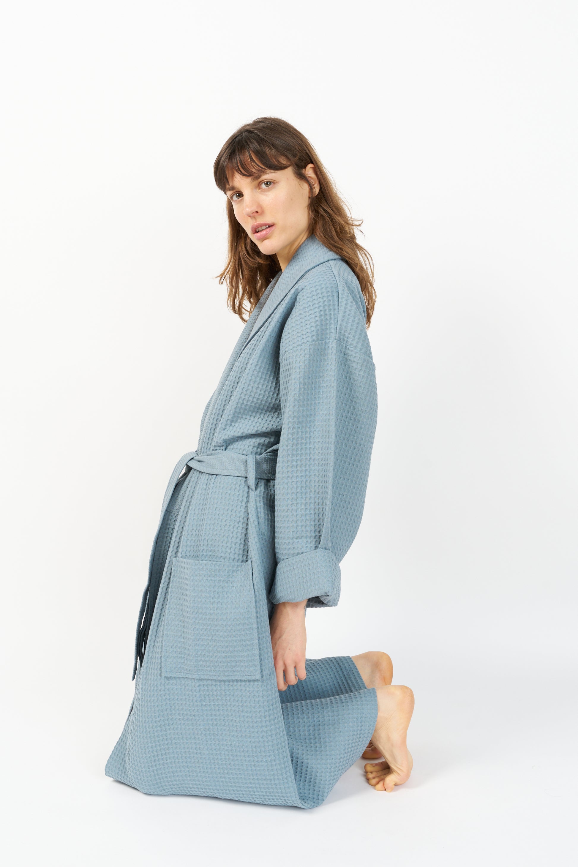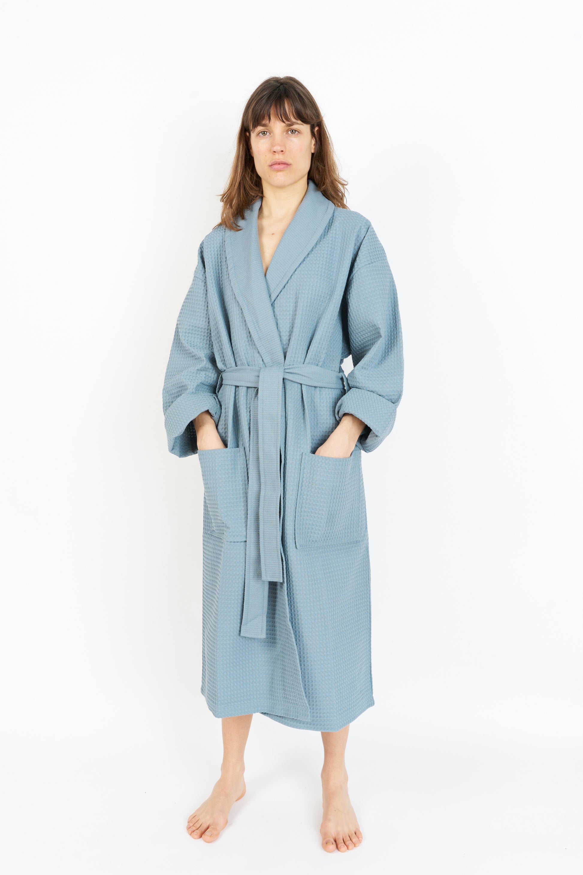 House Babylon’s waffle bathrobe is crafted from organic Turkish cotton and are Oeko-Tex certified to be fully free of any harmful chemicals. The waffle bathrobe is lightweight, softly textured and woven at 230 grams per square meter. This unisex bathrobe offers a relaxed fit featuring a lapel, a removable belt and capacious pockets. Made in Egypt.